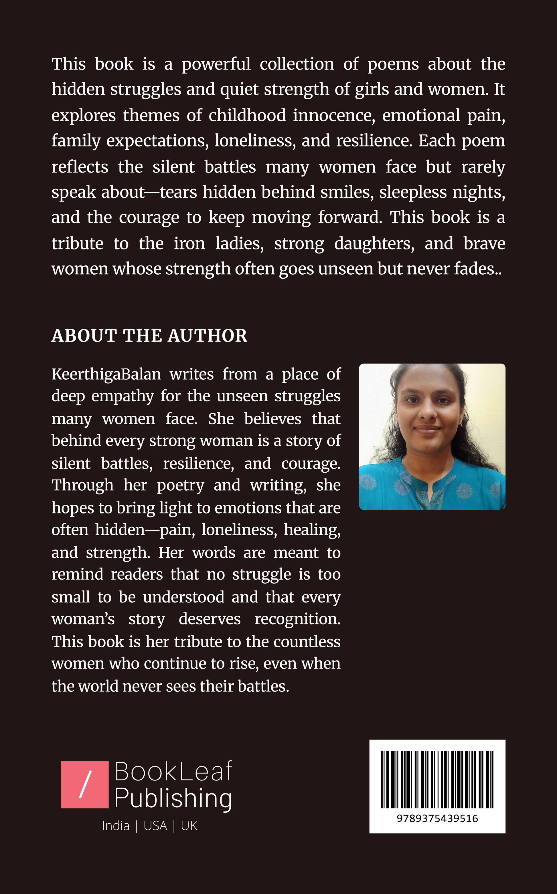 This book is a collection of deeply emotional poems that explore the hidden struggles many girls and women carry throughout their lives. From childhood innocence to silent heartbreaks, from expectations placed on daughters to the invisible weight of family responsibilities, these pages reveal the emotions that are often buried beneath strength.