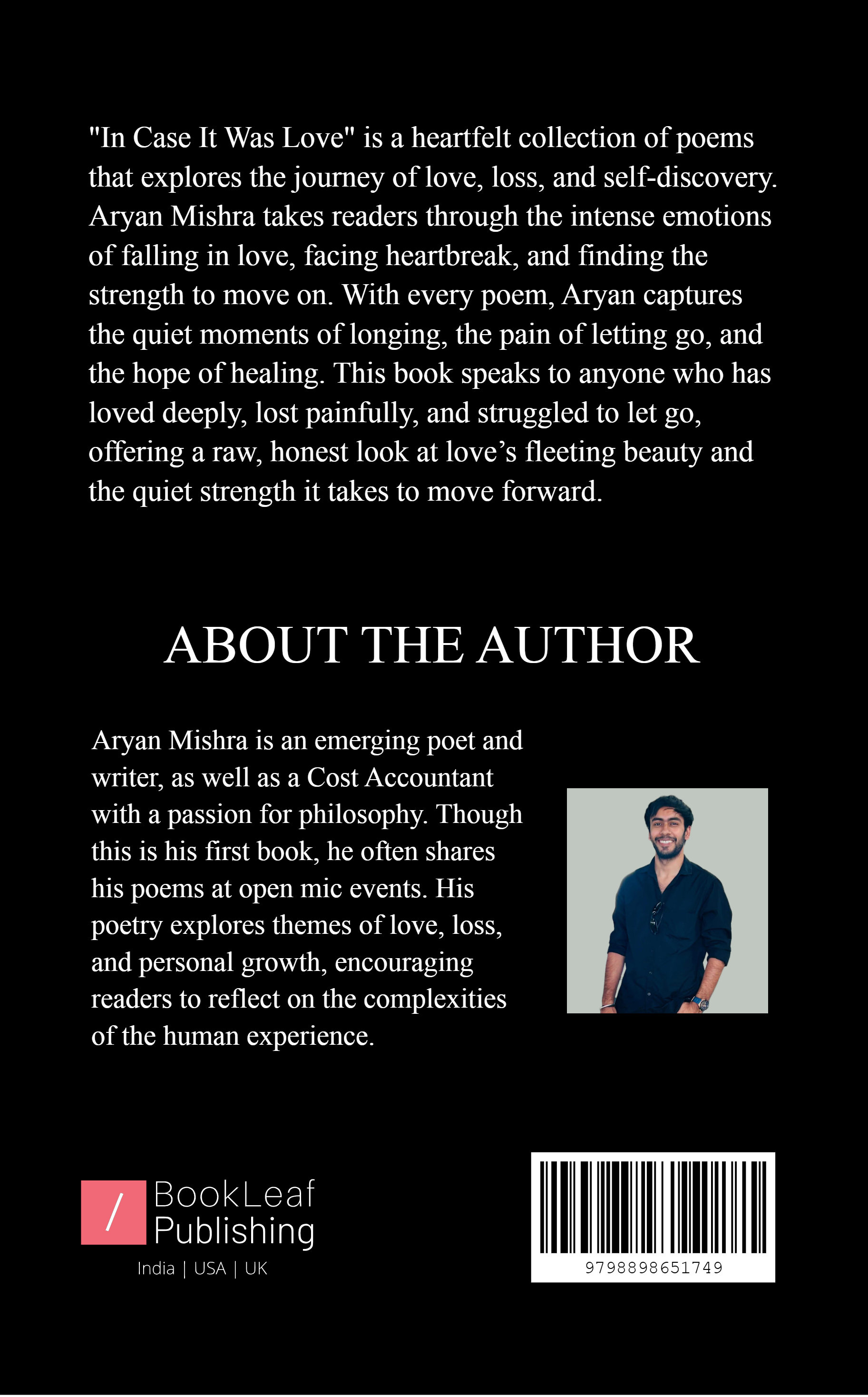"In Case It Was Love" is a heartfelt collection of poems that explores the journey of love, loss, and self-discovery. Aryan Mishra takes readers through the intense emotions of falling in love, facing heartbreak, and finding the strength to move on. With every poem, Aryan captures the quiet moments of longing, the pain of letting go, and the hope of healing. This book speaks to anyone who has loved deeply, lost painfully, and struggled to let go, offering a raw, honest look at love’s fleeting beauty and the quiet strength it takes to move forward.