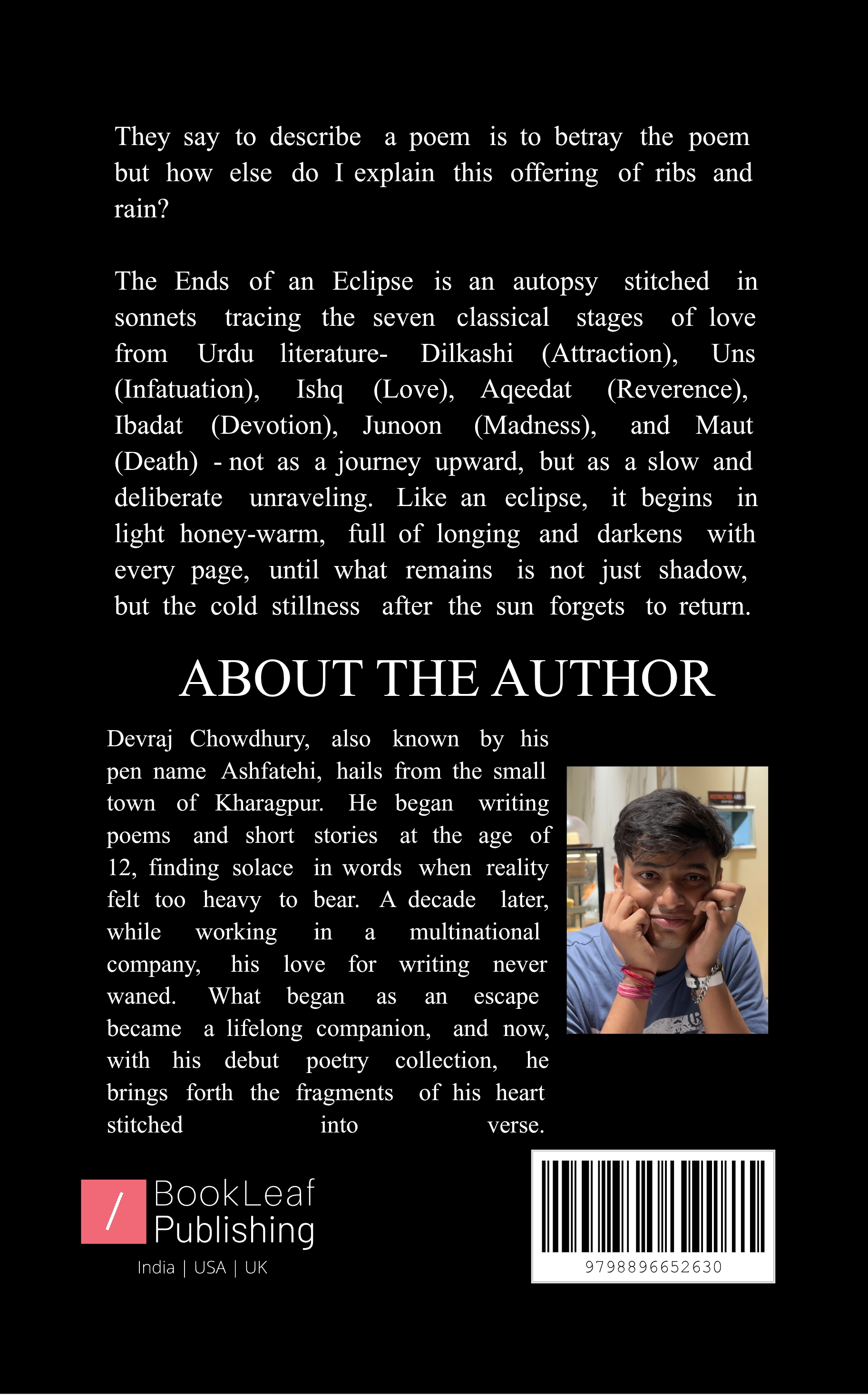 Devraj Chowdhury, also known by his pen name Ashfatehi, hails from the small town of Kharagpur. He began writing poems and short stories at the age of 12, finding solace in words when reality felt too heavy to bear. A decade later, while working in a multinational company, his love for writing never waned. What began as an escape became a lifelong companion, and now, with his debut poetry collection, he brings forth the fragments of his heart stitched into verse.