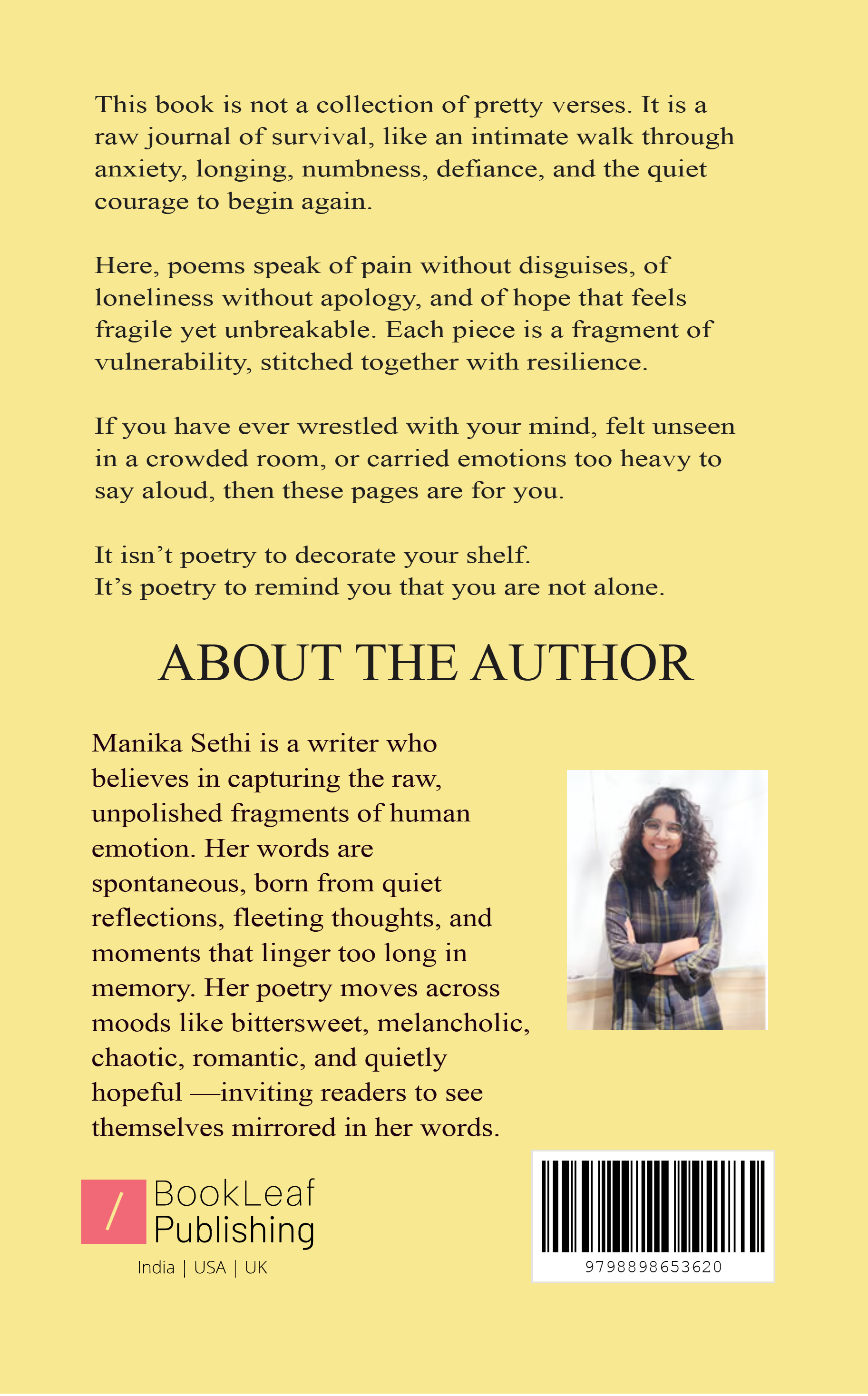 This collection of 30 poems journeys through chaos, numbness, love, and resilience. Each piece is a snapshot of unspoken thoughts and moments we carry but rarely voice. Honest and unpolished, these poems are written for anyone who has ever felt too much or nothing at all, offering comfort in knowing that survival itself is a kind of poetry.