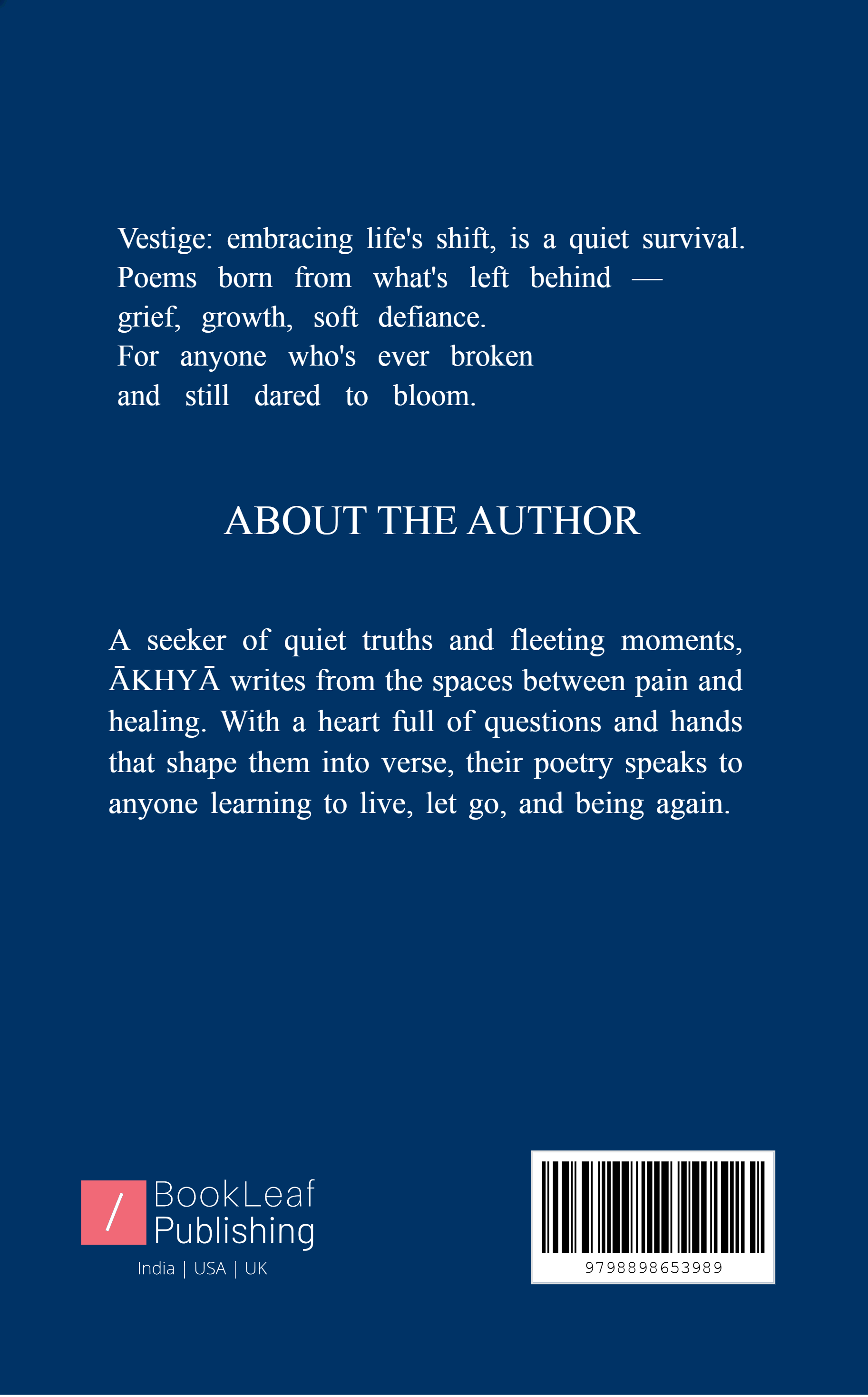 Vestige: Embracing life's shift is a tender exploration of what remains after life's unraveling. Through poems of quiet rebellion, healing, loss, and becoming, this collection captures the fragile yet resilient nature of the human spirit.
