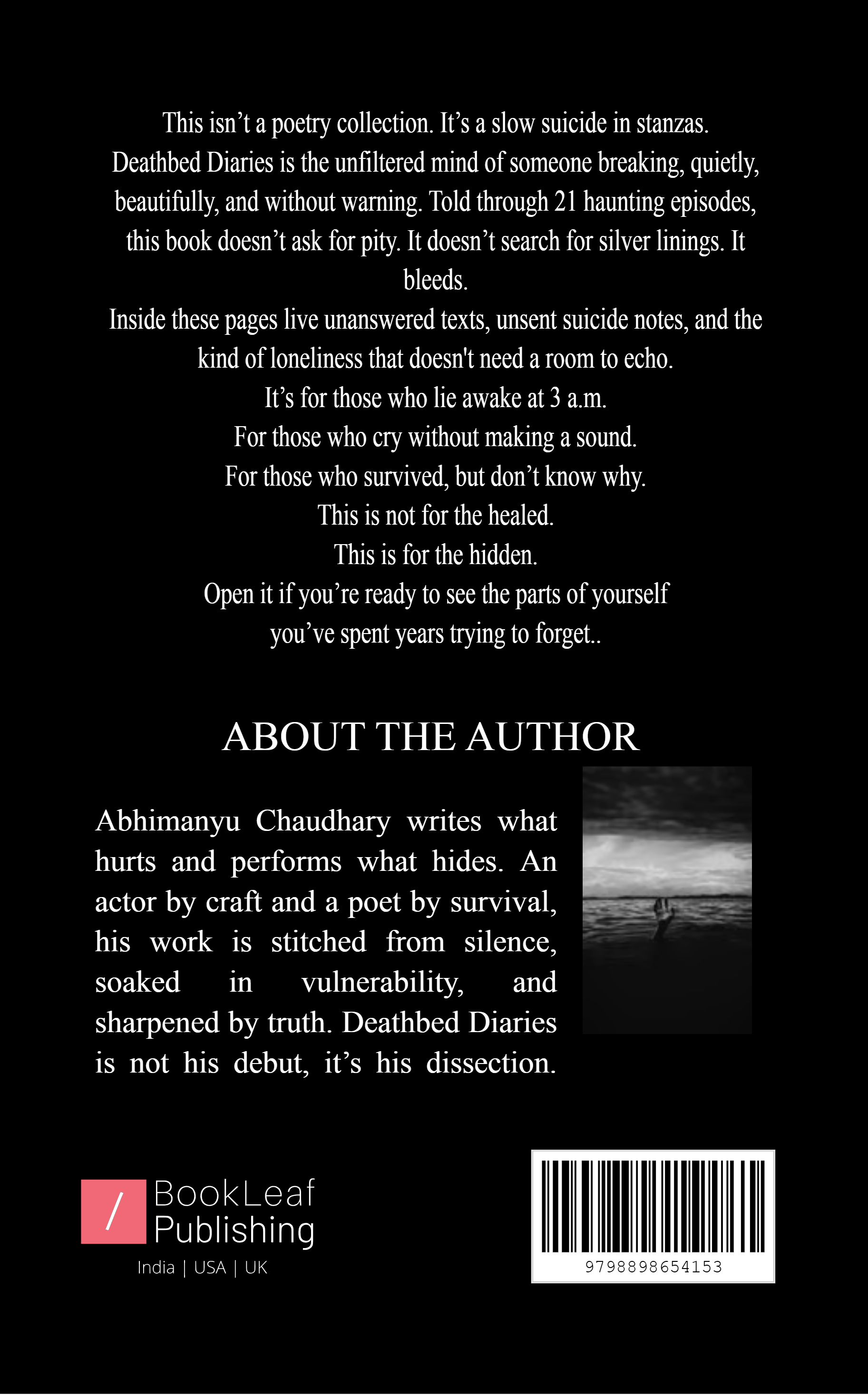 Deathbed Diaries is not a poetry collection, it's a raw confession. Told through 21 dark, emotionally charged episodes, this book captures the slow collapse of a mind battling anxiety, trauma, and suicidal silence. Abhimanyu Chaudhary, an actor and writer shaped by pain, turns every stanza into survival. These aren’t just poems, they’re the thoughts you never said out loud, the nights you barely made it through, and the feelings no one noticed. For the ones who break quietly and love loudly, this book doesn’t promise healing,it promises you’re not alone.