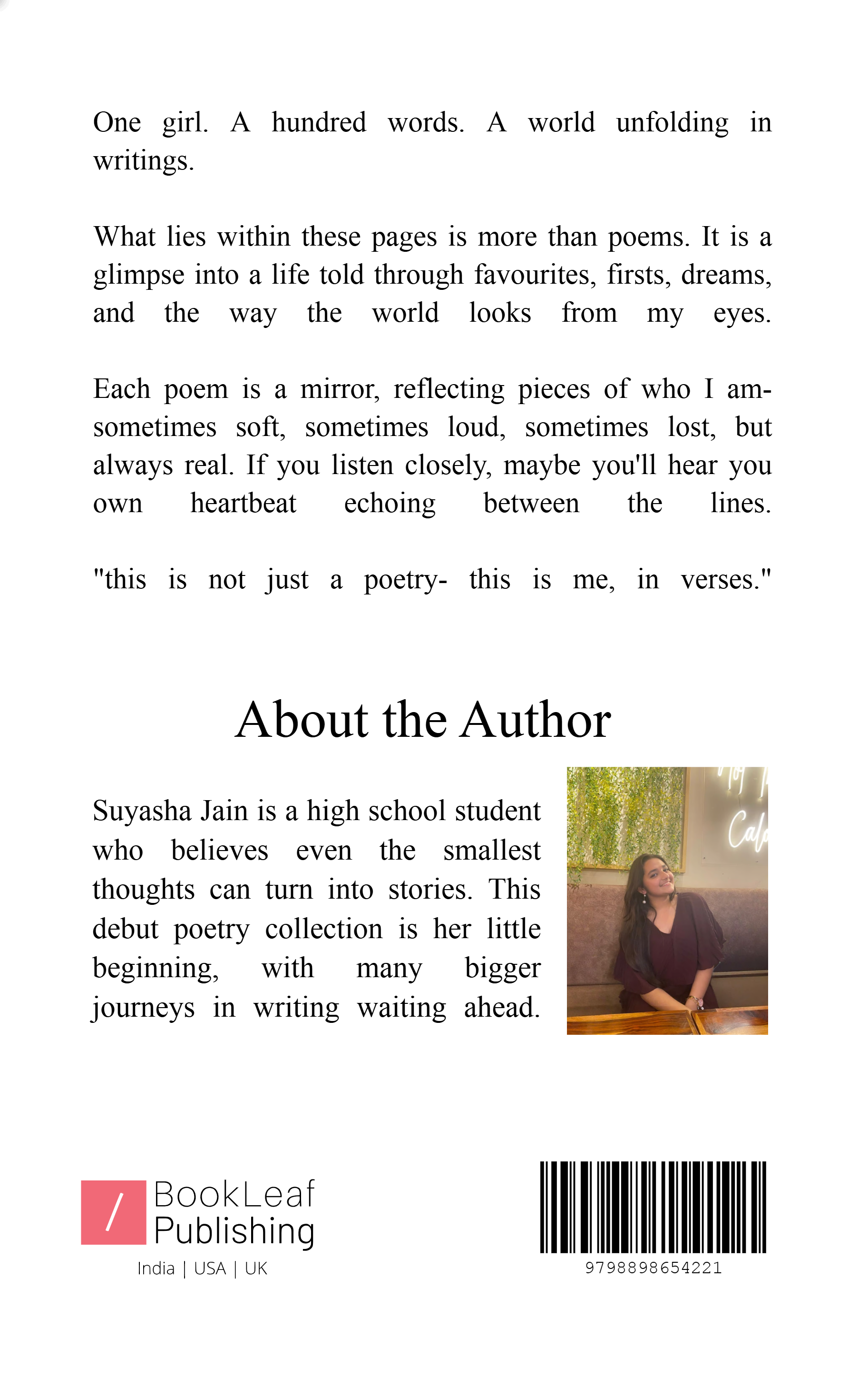 Simple, honest and expressive, these verses offer glimpses of her inner life. More than just words, this collection is a window into her heart, capturing the essence of growing up, self-discovery, and the beauty she finds in everyday life.