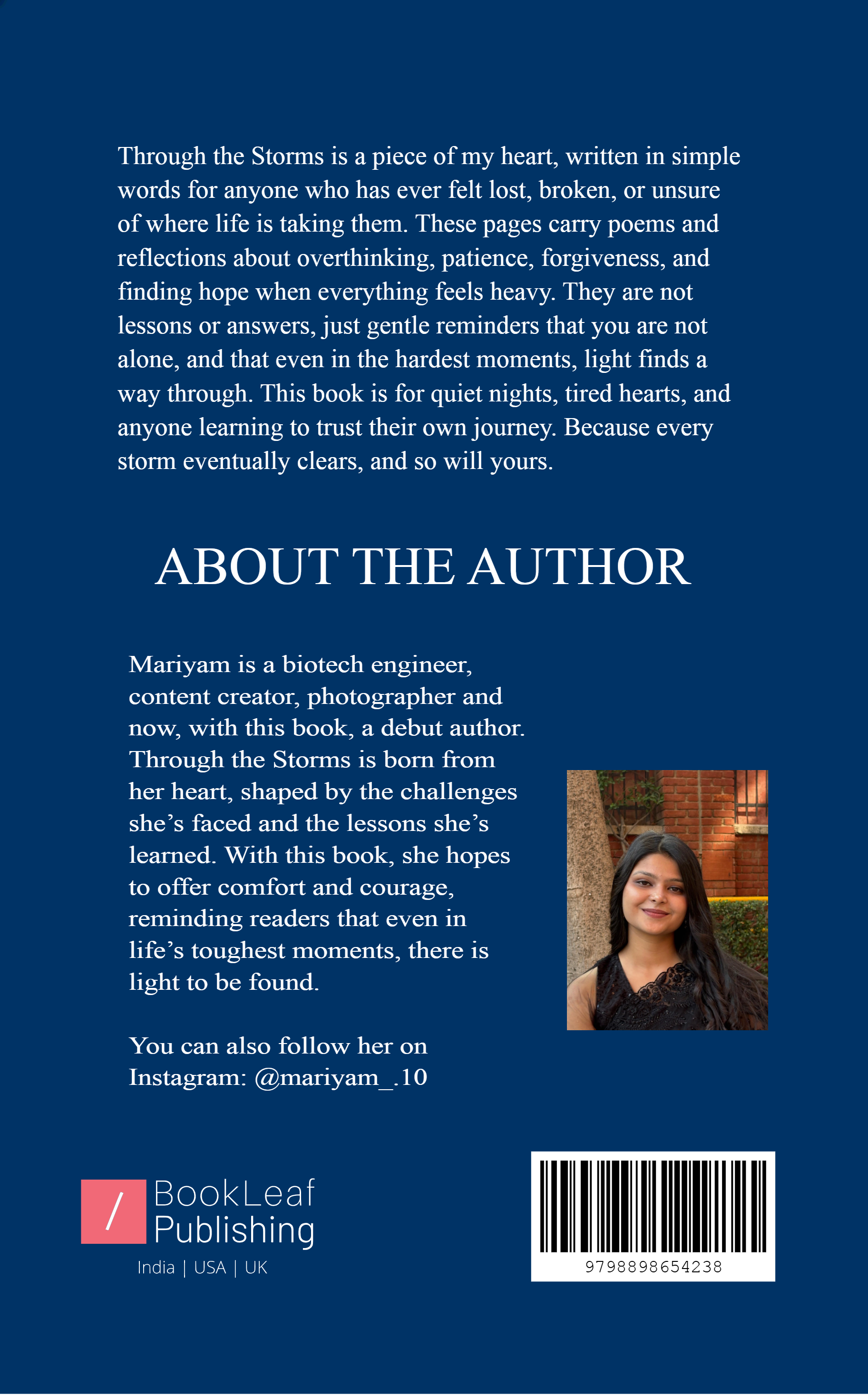 Through the Storms is a piece of my heart, written in simple words for anyone who has ever felt lost, broken, or unsure of where life is taking them. These pages carry poems and reflections about overthinking, patience, forgiveness, and finding hope when everything feels heavy. They are not lessons or answers, just gentle reminders that you are not alone, and that even in the hardest moments, light finds a way through. This book is for quiet nights, tired hearts, and anyone learning to trust their own journey. Because every storm eventually clears, and so will yours.