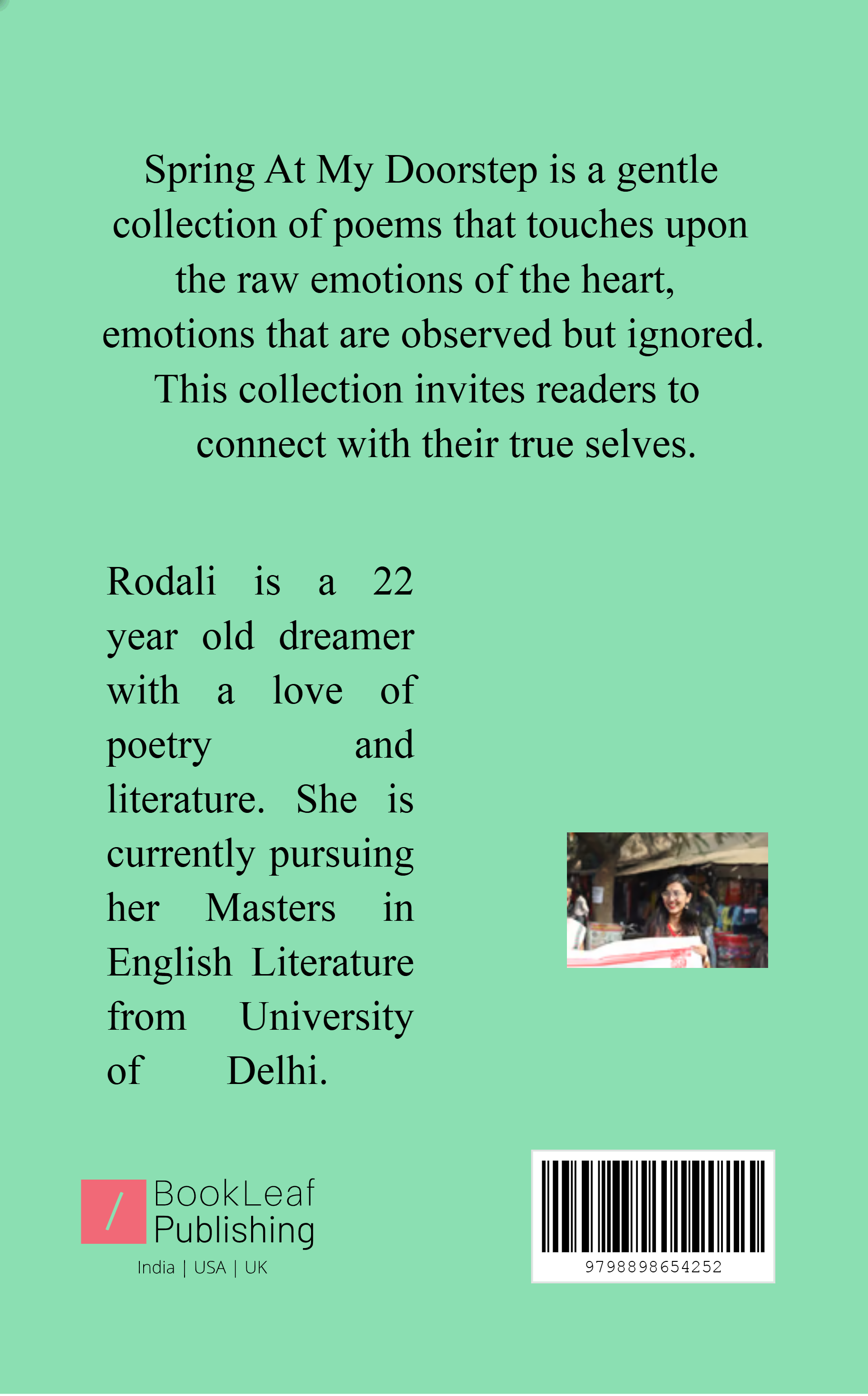 Spring At My Doorstep is a gentle collection of poems that touch upon raw human emotions. The poems weave a deep tapestry of thoughts that are often overlooked. This collection invites readers to connect to the world around and also to their truest selves.