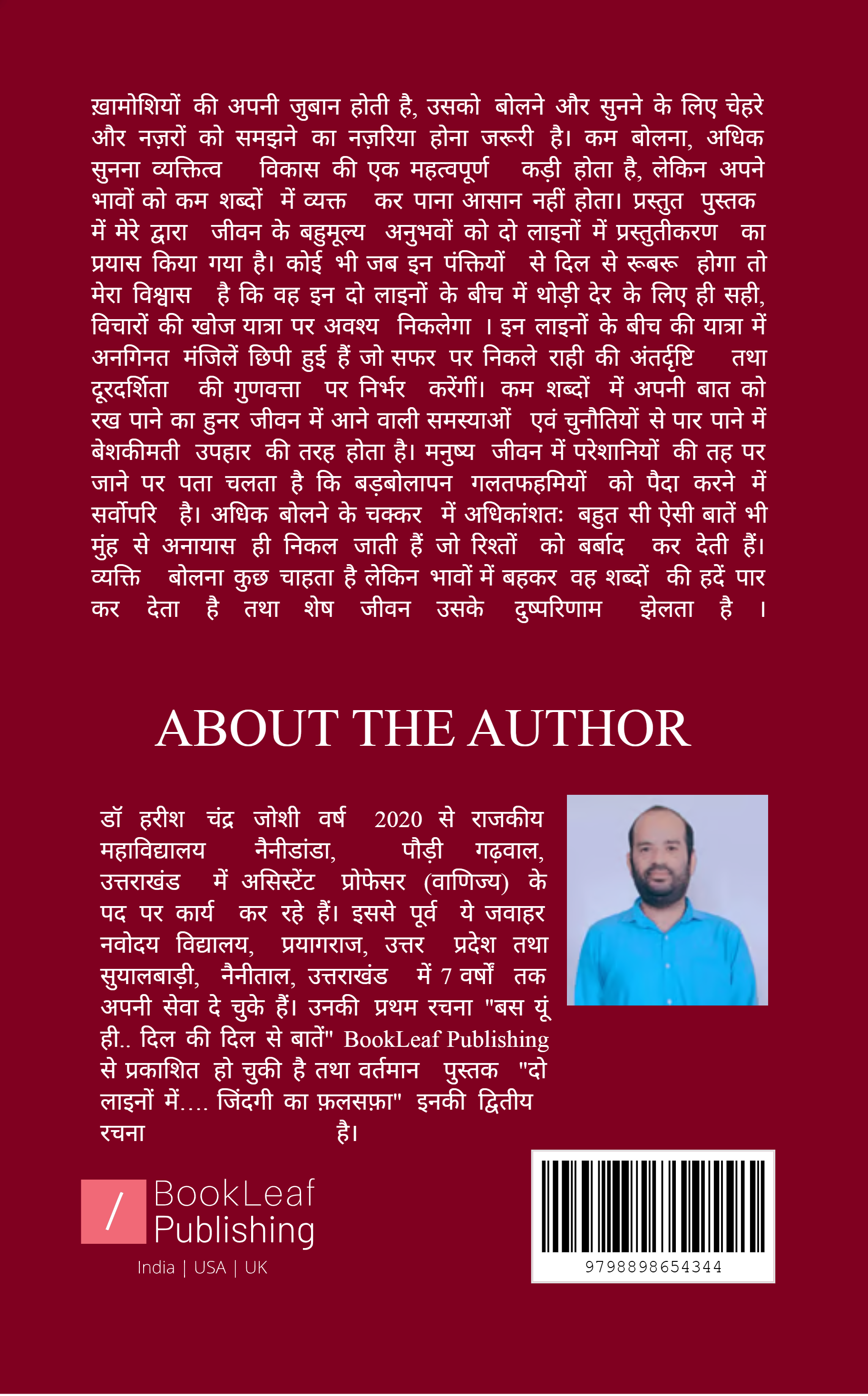 ख़ामोशियों की अपनी जुबान होती है, उसको बोलने और सुनने के लिए चेहरे और नज़रों को समझने का नज़रिया होना जरूरी है। कम बोलना, अधिक सुनना व्यक्तित्व विकास की एक महत्वपूर्ण कड़ी होता है, लेकिन अपने भावों को कम शब्दों में व्यक्त कर पाना आसान नहीं होता। प्रस्तुत पुस्तक में मेरे द्वारा जीवन के बहुमूल्य अनुभवों को दो लाइनों में प्रस्तुतीकरण का प्रयास किया गया है। कोई भी जब इन पंक्तियों से दिल से रूबरू होगा तो मेरा विश्वास है कि वह इन दो लाइनों के बीच में थोड़ी देर के लिए ही सही, विचारों की खोज यात्रा पर अवश्य निकलेगा । इन लाइनों के बीच की यात्रा में अनगिनत मंजि़लें छिपी हुई हैं जो सफर पर निकले राही की अंतर्दृष्टि तथा दूरदर्शिता की गुणवत्ता पर निर्भर करेंगीं।