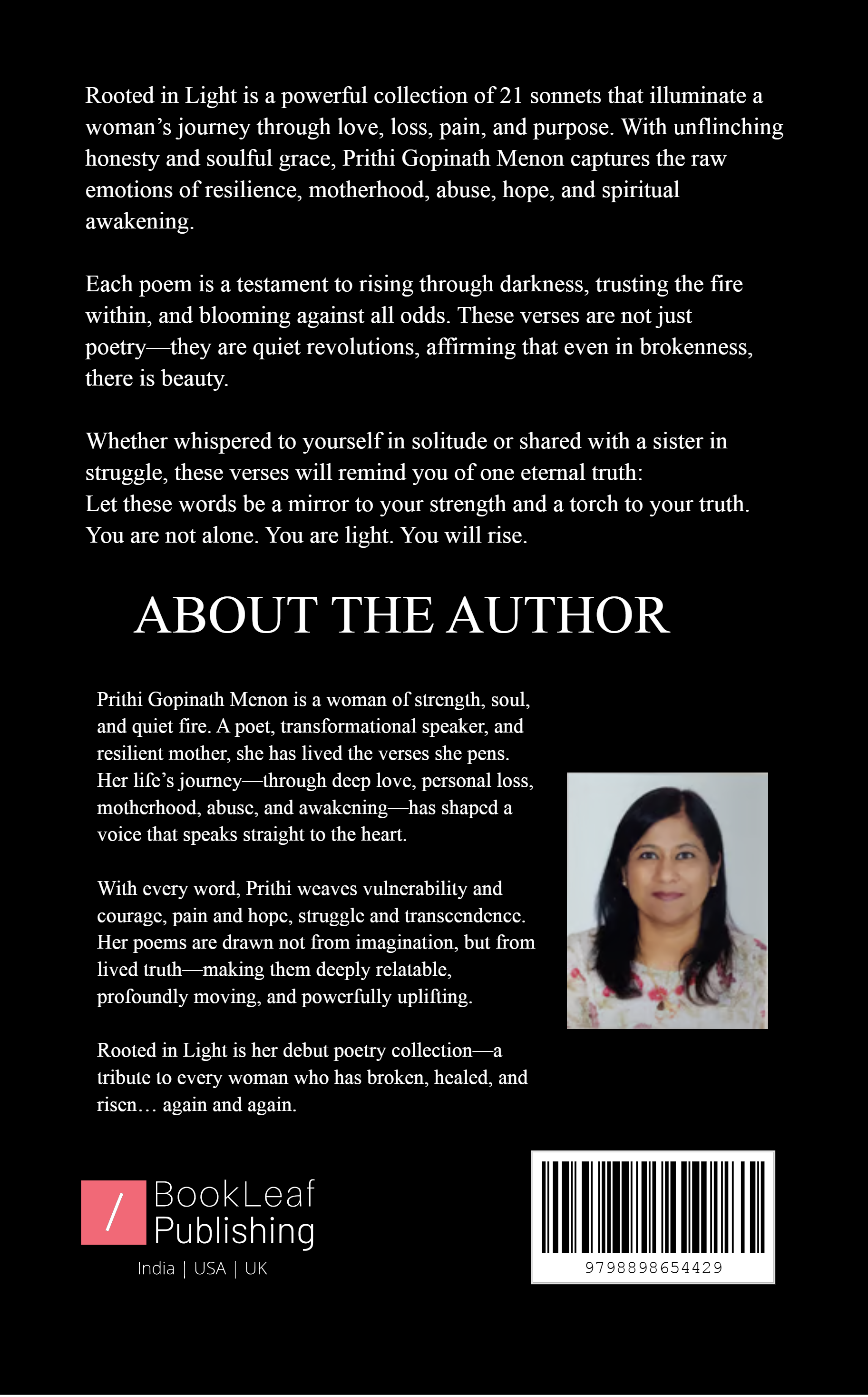 Rooted in Light is a soul-stirring collection of 21 original sonnets chronicling one woman’s courageous journey through life’s deepest valleys and highest awakenings. Through the themes of motherhood, resilience, love, and spiritual transformation, Prithi Gopinath Menon gives voice to every woman who has faced silence, sorrow, and struggle—and still chosen to rise.