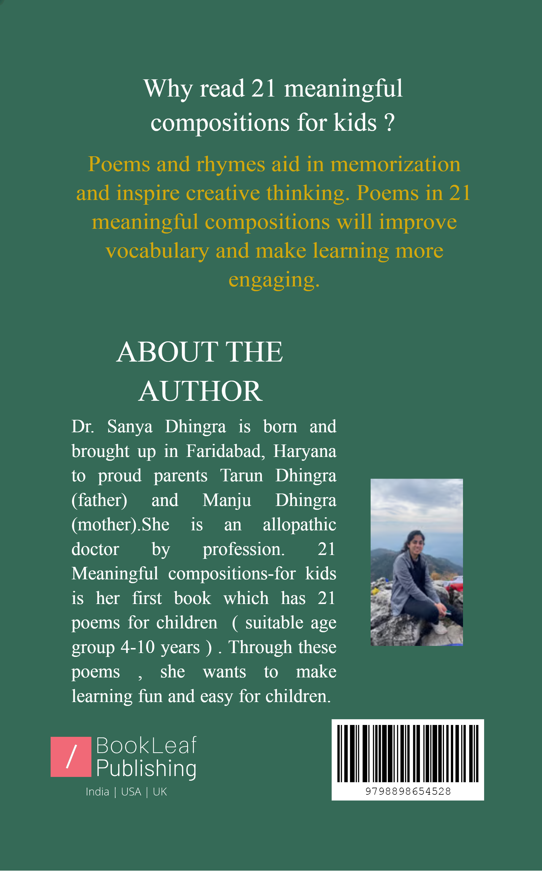21 Meaningful Compositions for kids is a poem book for children. It is suitable for children in the age group of 4-10 years and contains poems on various real life learning’s like days in a week , seasons , practicing gratitude and great virtues. These poems are a fun collection of verses in a simple language and playful rhythms.
