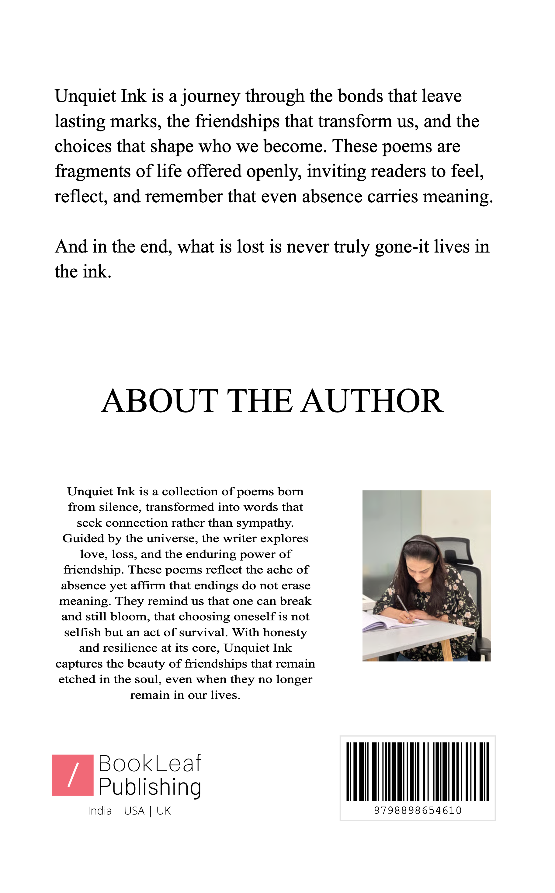 Unquiet Ink is a journey through the bonds that leave lasting marks, the friendships that transform us, and the choices that shape who we become. These poems are fragments of life offered openly, inviting readers to feel, reflect, and remember that even absence carries meaning.
