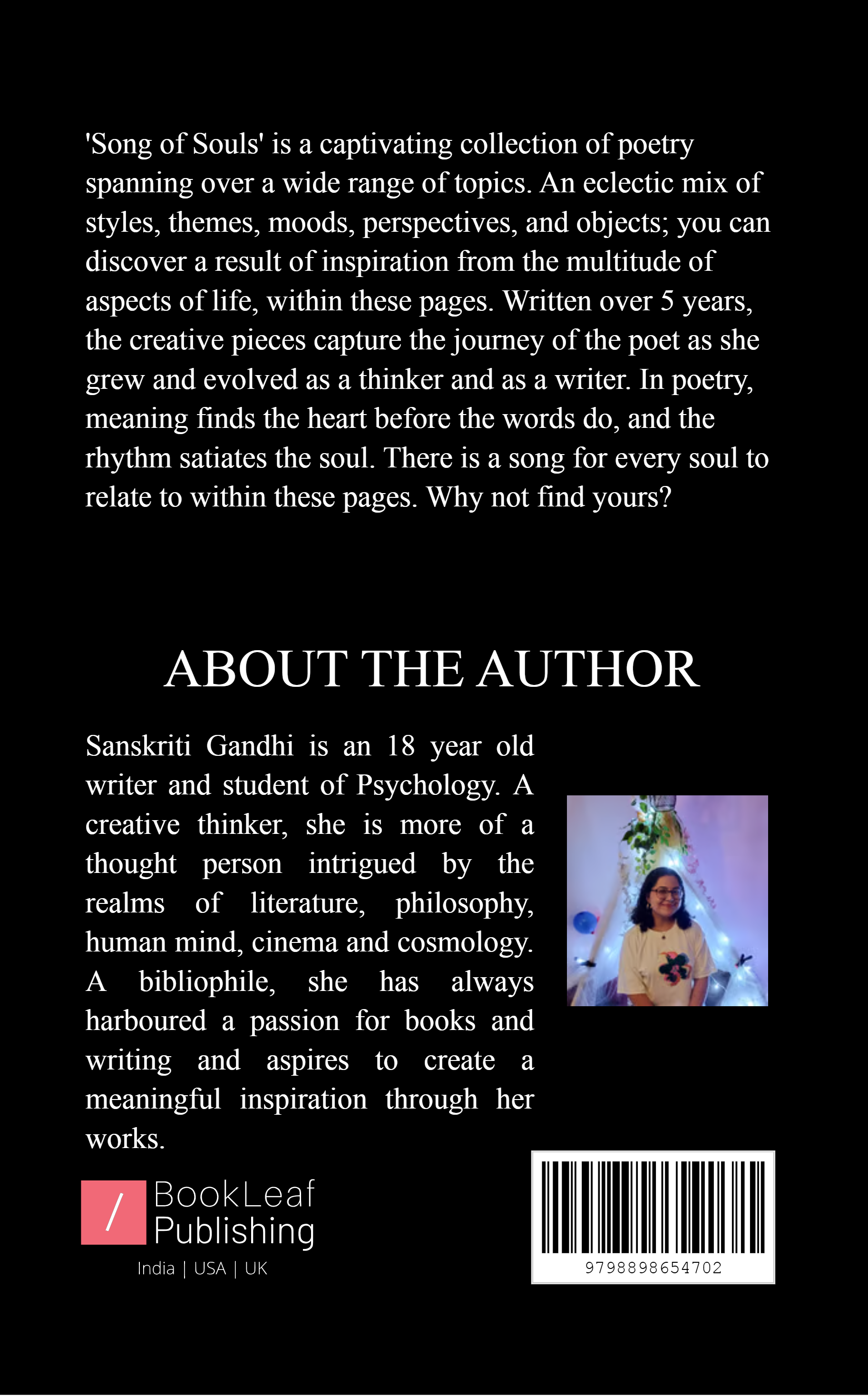 'Song of Souls' is a captivating collection of poetry spanning over a wide range of topics. An eclectic mix of styles, themes, moods, perspectives, and objects; you can discover a result of inspiration from the multitude of aspects of life, within these pages. Written over 5 years, the creative pieces capture the journey of the poet as she grew and evolved as a thinker and as a writer. In poetry, meaning finds the heart before the words do, and the rhythm satiates the soul. There is a song for every soul to relate to within these pages. Why not find yours?