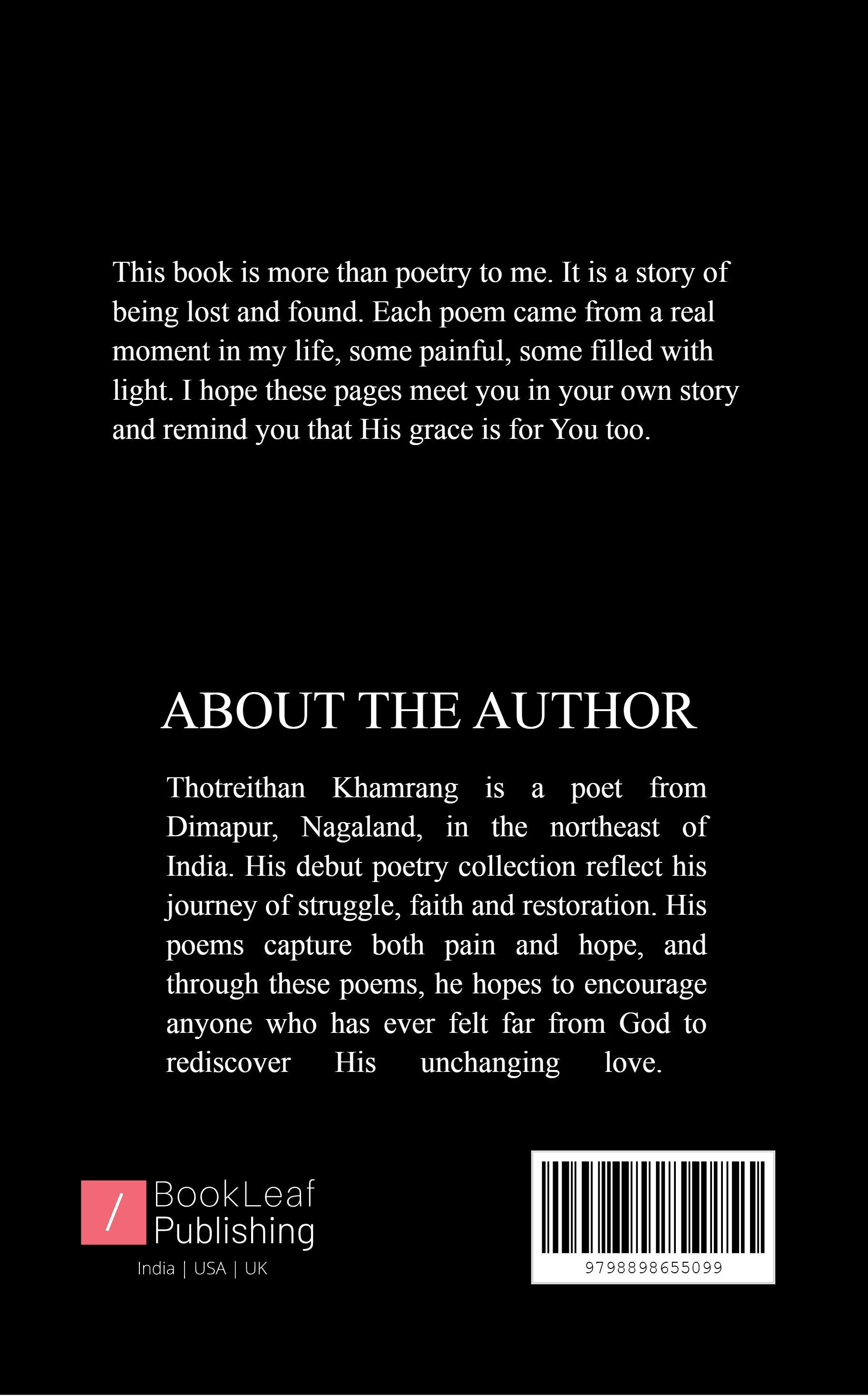 This collection of poems shares a personal journey of drifting from God and being gently led back by His grace. Each piece is a glimpse into the author's personal walk. Whether you are seeking encouragement in your own faith or simply longing for words that speak to the soul, this book reminds us that no one is ever beyond God's reach.