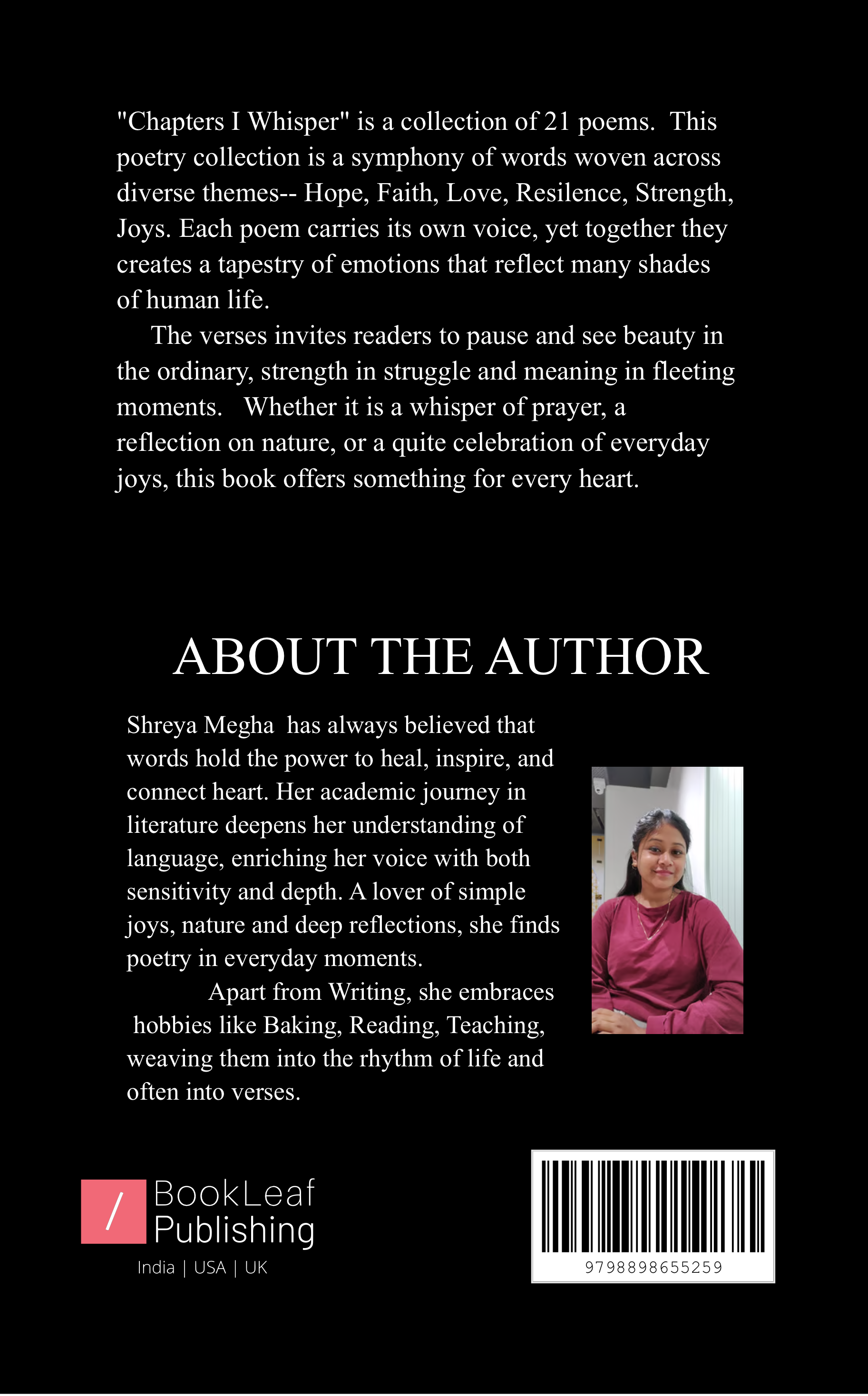 In “Chapters I Whisper” , poetry becomes a guide to finding light in everyday life. Each pieces celebrates hope, joy, strength of human spirit, offering readers inspiration and gentle reminders that beauty and meaning can be found in smallest moments.