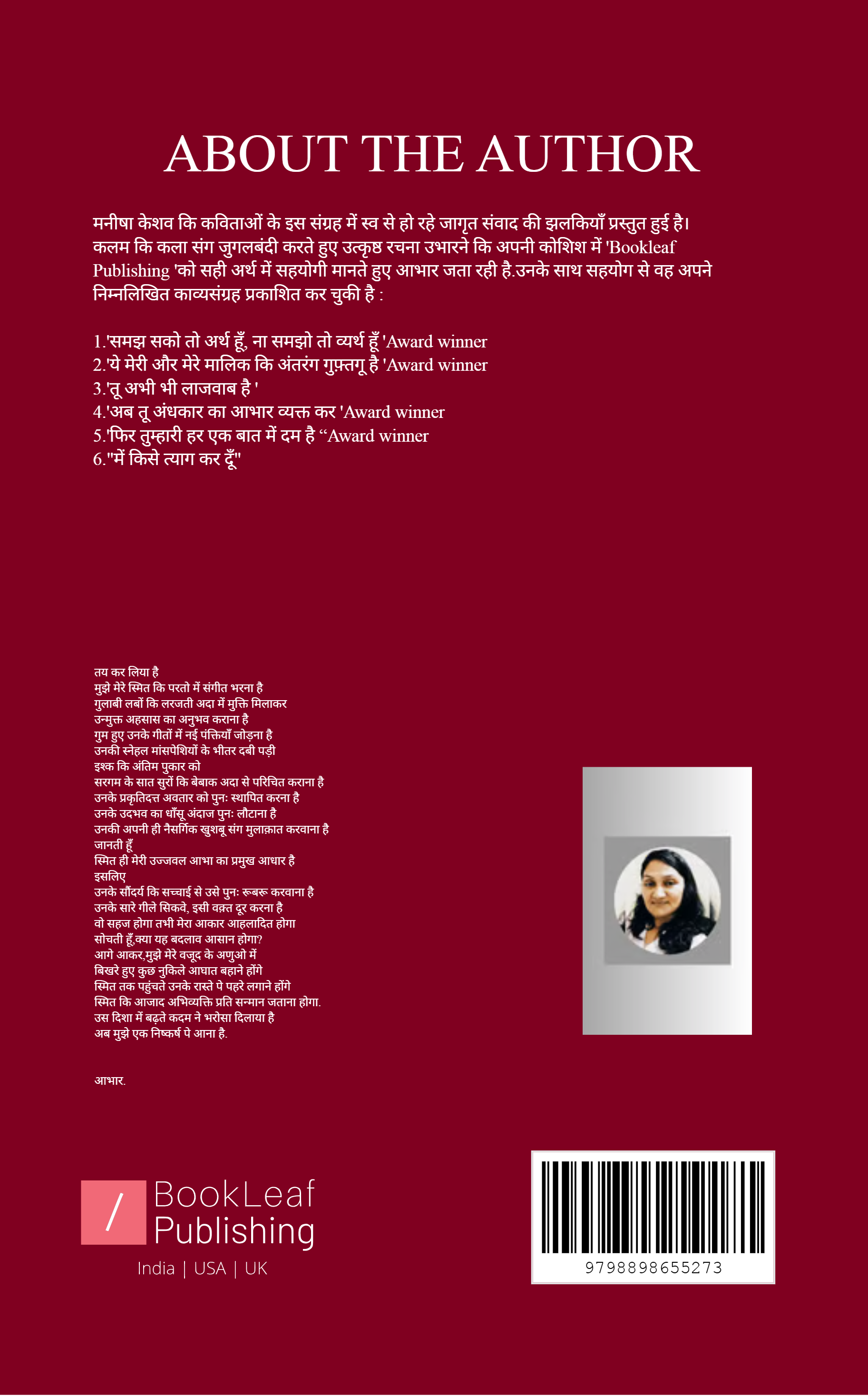 "में किसे त्याग कर दूँ" काव्यसंग्रह में मनीषा केशव जीवन आधार की महत्वपूर्ण परतो में संतुलन-असंतुलन की प्रक्रिया से गुजरते हुए ,बेबाक पंक्तियों क़ो अपने प्रवाही अंदाज में प्रस्तुत करते हुए सर्व वाचक गण प्रति आभार जता रही है.