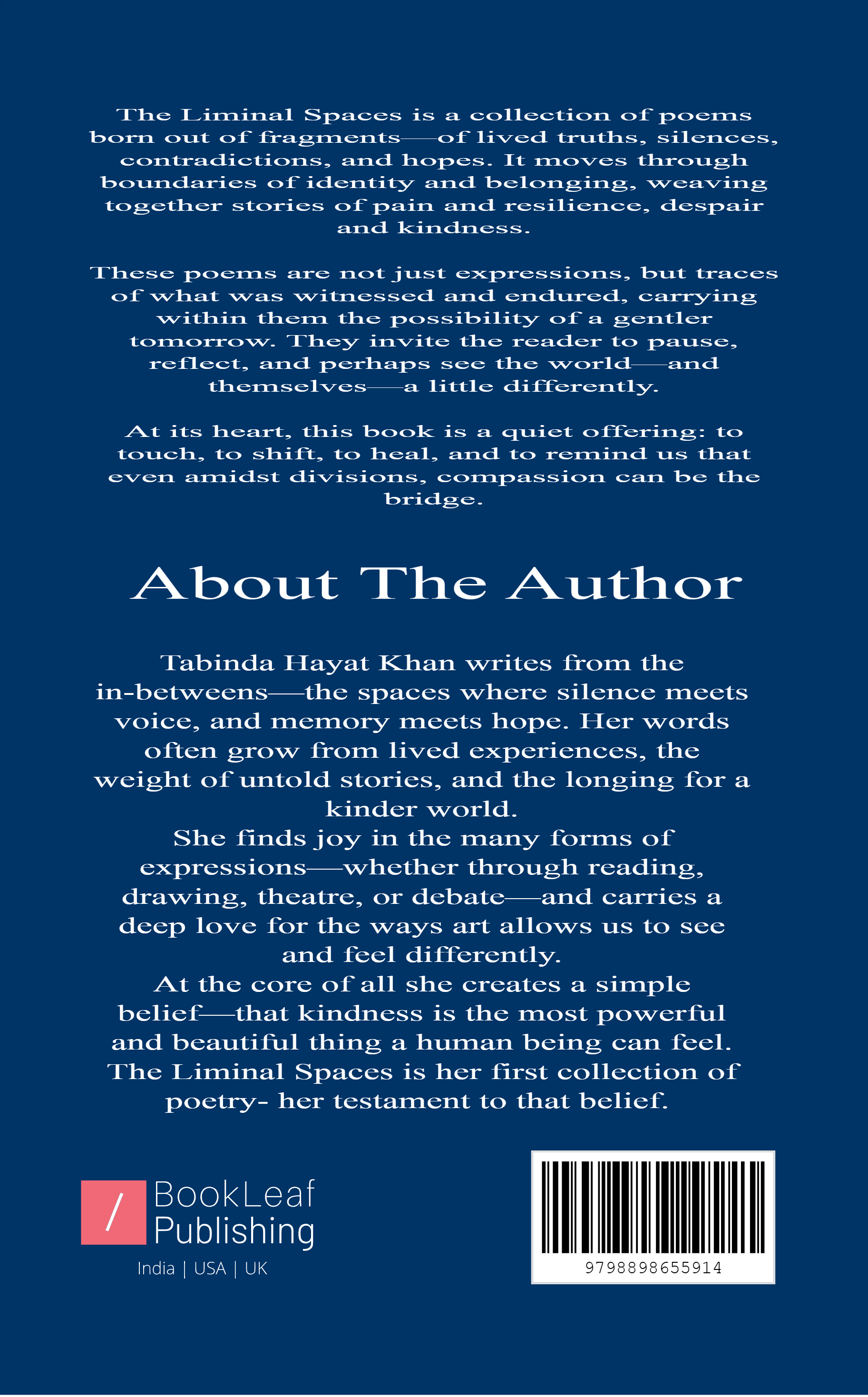The Liminal Spaces: Identities Across Boundaries is a debut poetry collection that captures the complexities of living between worlds-of memory, belonging, injustice, and hope. Each poem offers a glimpse into moments of struggle and resilience, written in a voice that is both personal and universal. Moving beyond borders and labels, the collection speaks to readers searching for meaning in contradictions and strength in vulnerability. A thoughtful and compelling read for anyone drawn to poetry that reflects the times we live in.