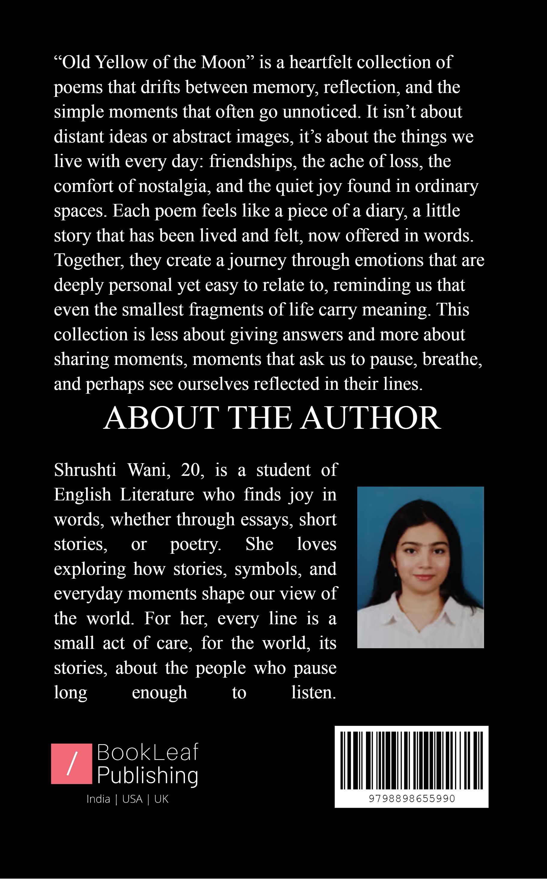 “Old Yellow of the Moon” is a heartfelt collection of poems that drifts between memory, reflection, and the simple moments that often go unnoticed. It isn’t about distant ideas or abstract images, it’s about the things we live with every day: the warmth of friendships, the ache of loss, the comfort of nostalgia, and the quiet joy found in ordinary spaces. Each poem feels like a piece of a diary, a little story that has been lived and felt, now offered in words. Together, they create a journey through emotions that are deeply personal yet easy to relate to, reminding us that even the smallest fragments of life carry meaning. This collection is less about giving answers and more about sharing