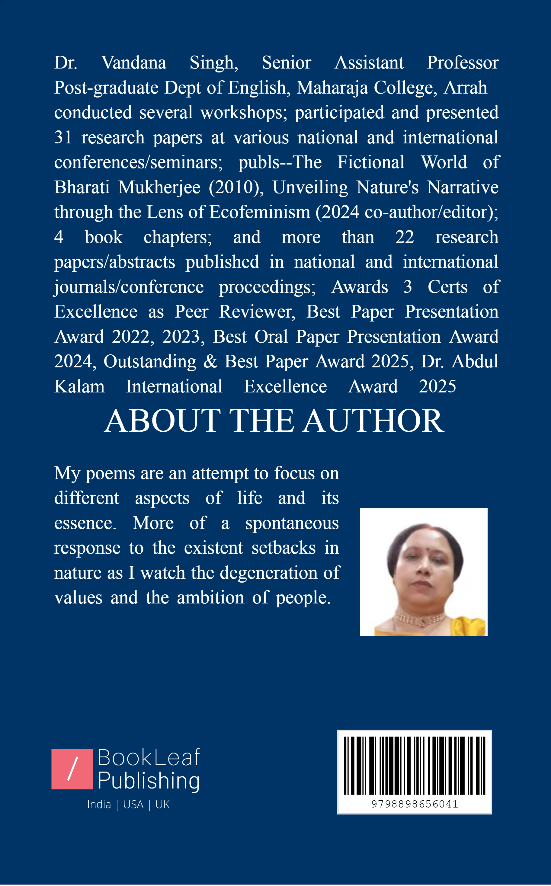 My poems are an attempt to focus on different aspects of life and its essence. More of a spontaneous response to the existent setbacks in nature as I watch the degeneration of values and the ambition of people. My poems reflect, Nature and Environmental Concerns, Nostalgia and Childhood Memories, Existential Questions and Philosophy, Loss and Grief, Hope and Resilience. Love and Relationships, Cultural and Social Commentary, Fantasy and Imagination, Spirituality and Reflection, and Globalization and Its Impact.