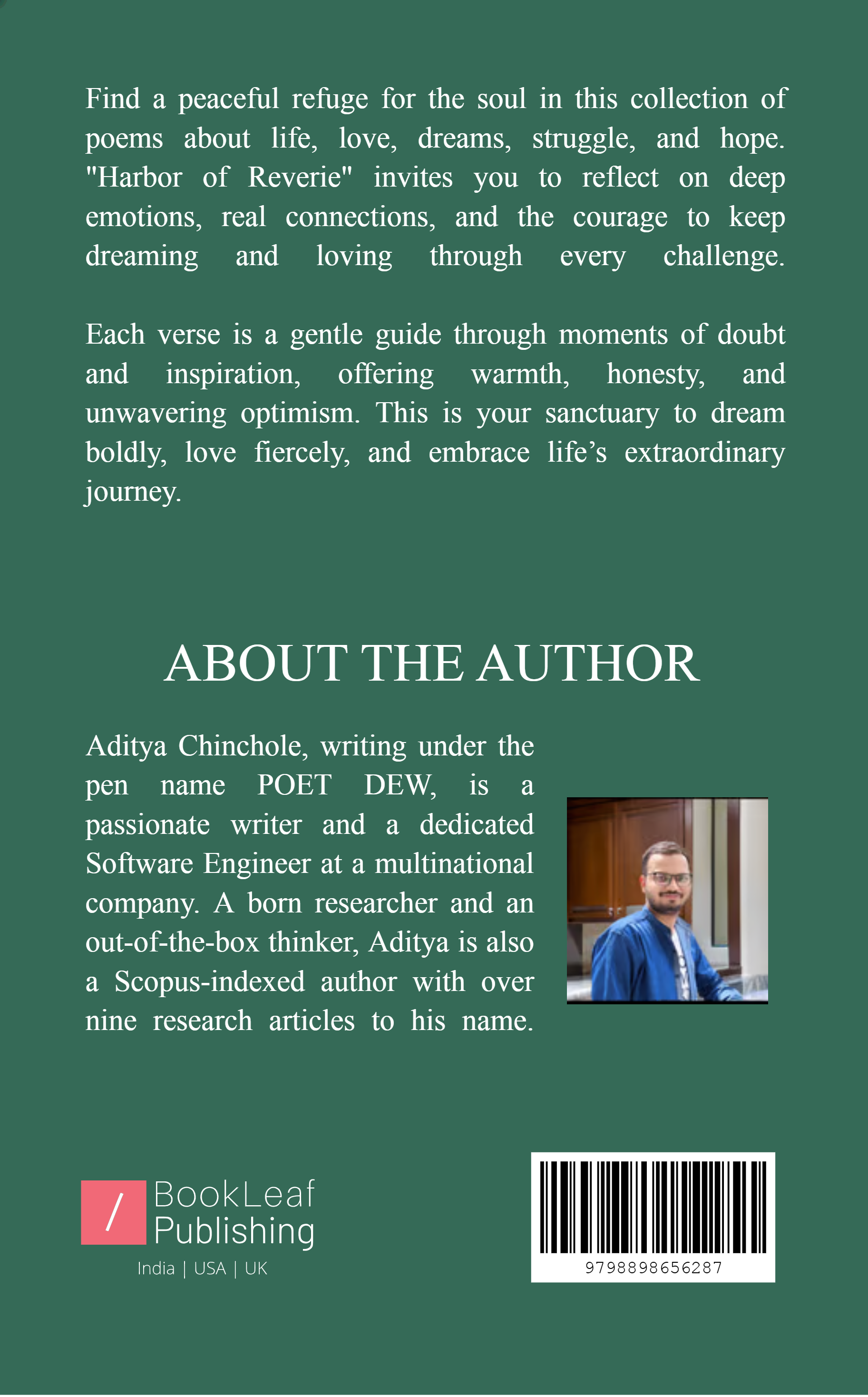 Harbor of Reverie is a sanctuary for the soul, where dreams and reality dance in quiet harmony. Through evocative verses, this collection explores life’s deepest currents—love’s fragile beauty, the art of connection, relentless dreams, and the strength born from struggle. Each poem is a gentle beacon guiding you through moments of doubt toward hope and renewal. This poetic refuge invites you to dream boldly, love fiercely, and embrace the luminous optimism that transforms everyday moments into extraordinary journeys. Step into your harbor—a place to reflect, heal, and soar.