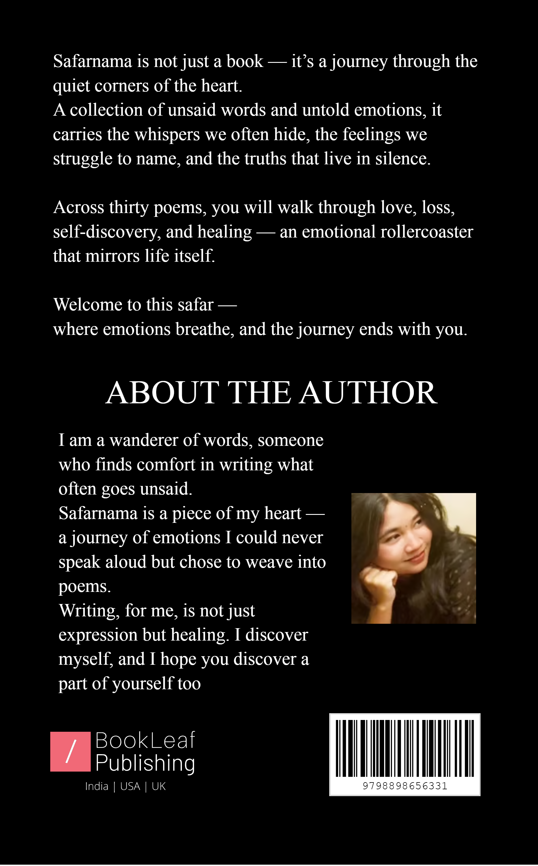 Safarnama is a heartfelt collection of poems that takes readers on a journey through unspoken emotions and untold stories. Each poem is a window into the silence we often carry — love that was never confessed, pain that was never voiced, strength that was quietly built. With simple yet powerful words, the book becomes an emotional companion for anyone who has felt unheard or unseen. More than poetry, it is a safar of self-discovery, healing, and reflection. Safarnama is where hidden feelings find their voice, and every reader discovers a part of themselves within its pages.