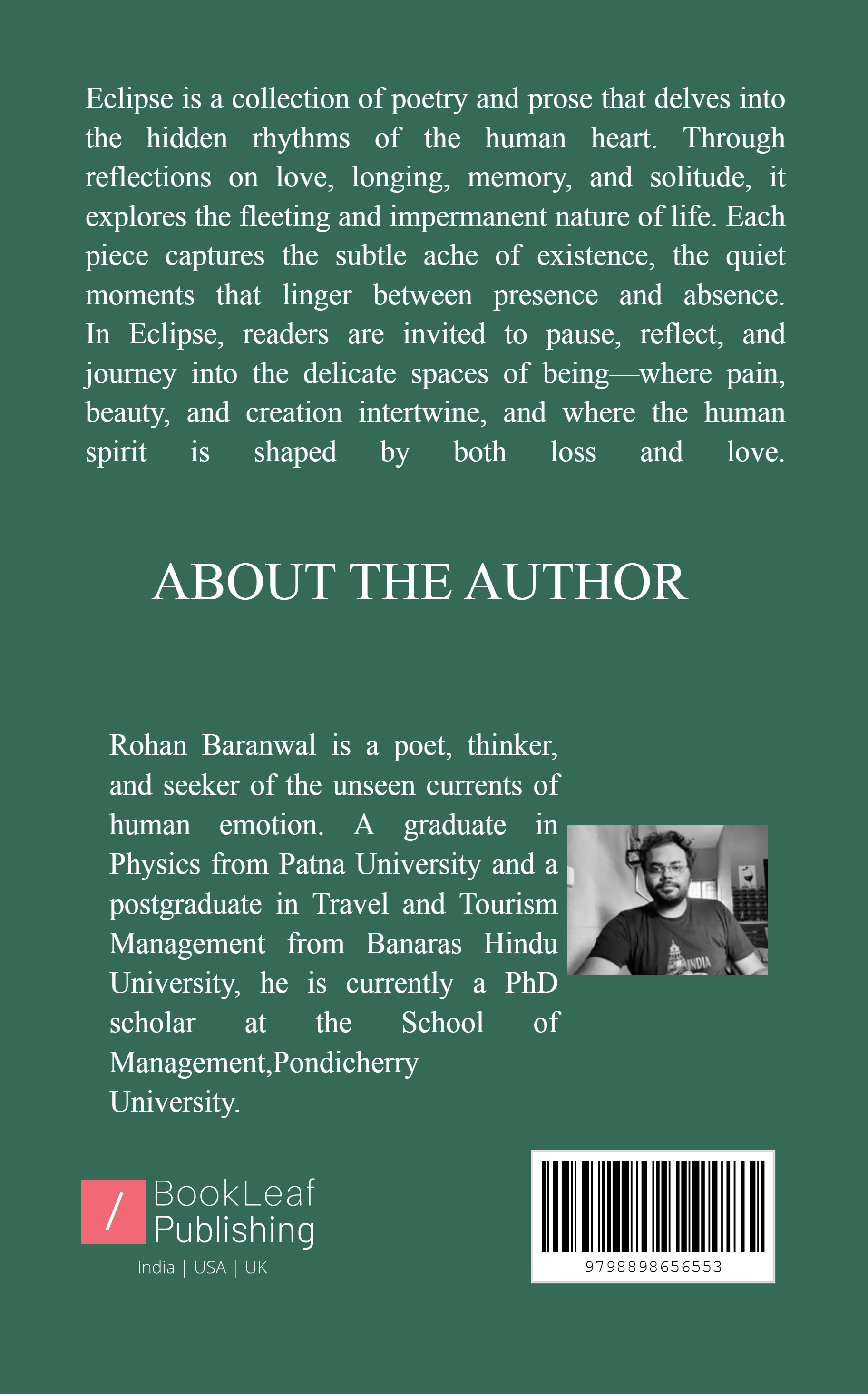 Eclipse is a collection of poems and prose that explores love, memory, solitude, and the fleeting nature of life. It reflects on the small moments that stay with us—the quiet ache of longing, the beauty found in presence and absence, and the human desire to understand and connect. Through these writings, readers are invited to pause, reflect, and experience life from different perspectives, finding meaning in both joy and sorrow, and discovering the subtle truths that shape our journey of becoming.