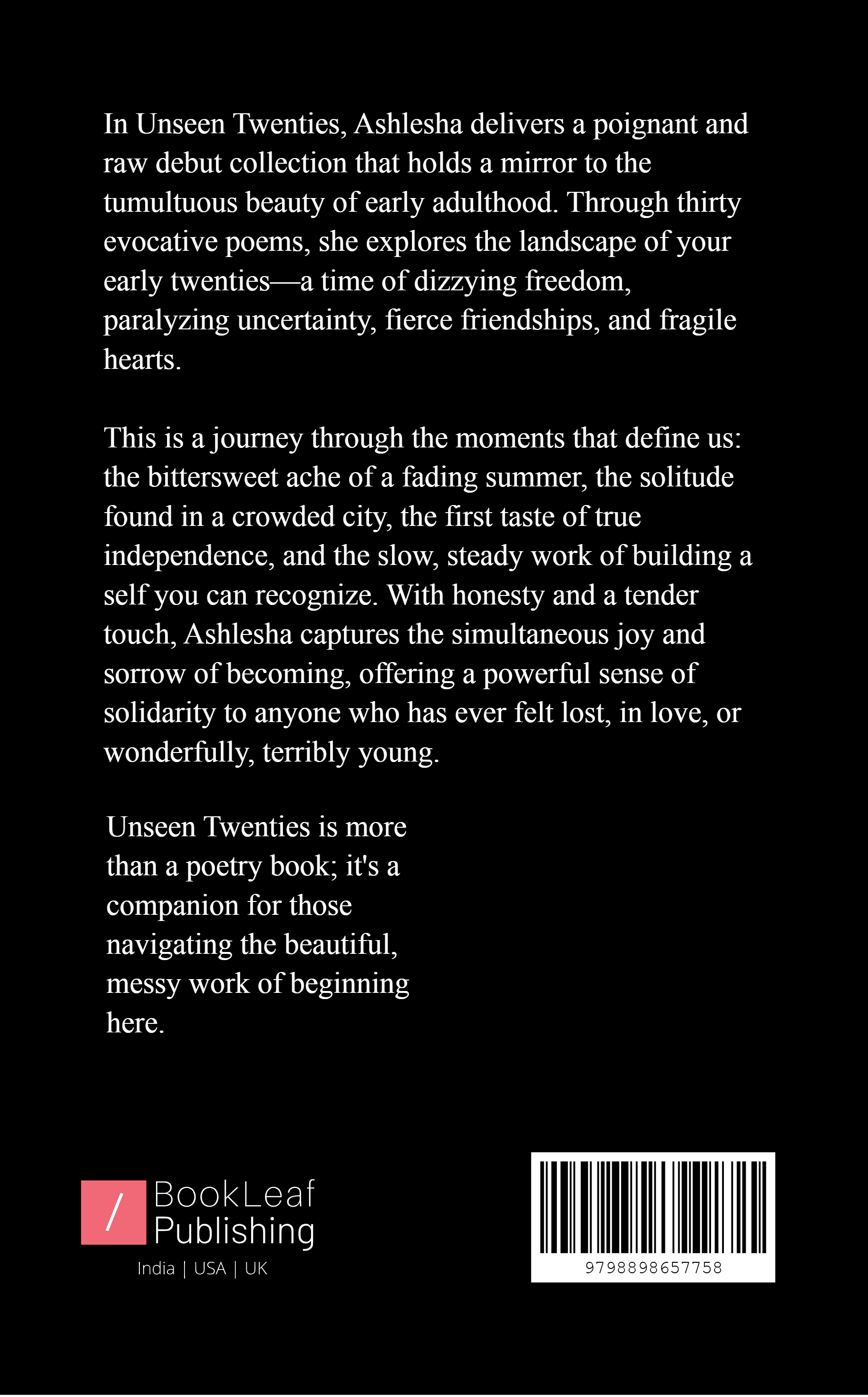 Ashlesha's Unseen Twenties is a tender and raw poetry collection that maps the emotional landscape of your early twenties. Through thirty poems, it captures the simultaneous joy and ache of becoming—the dizzying freedom, the paralyzing doubt, the friendships that become family, and the love that leaves its mark. This debut is a comforting companion for anyone navigating the beautiful, painful, and unforgettable work of building a self.