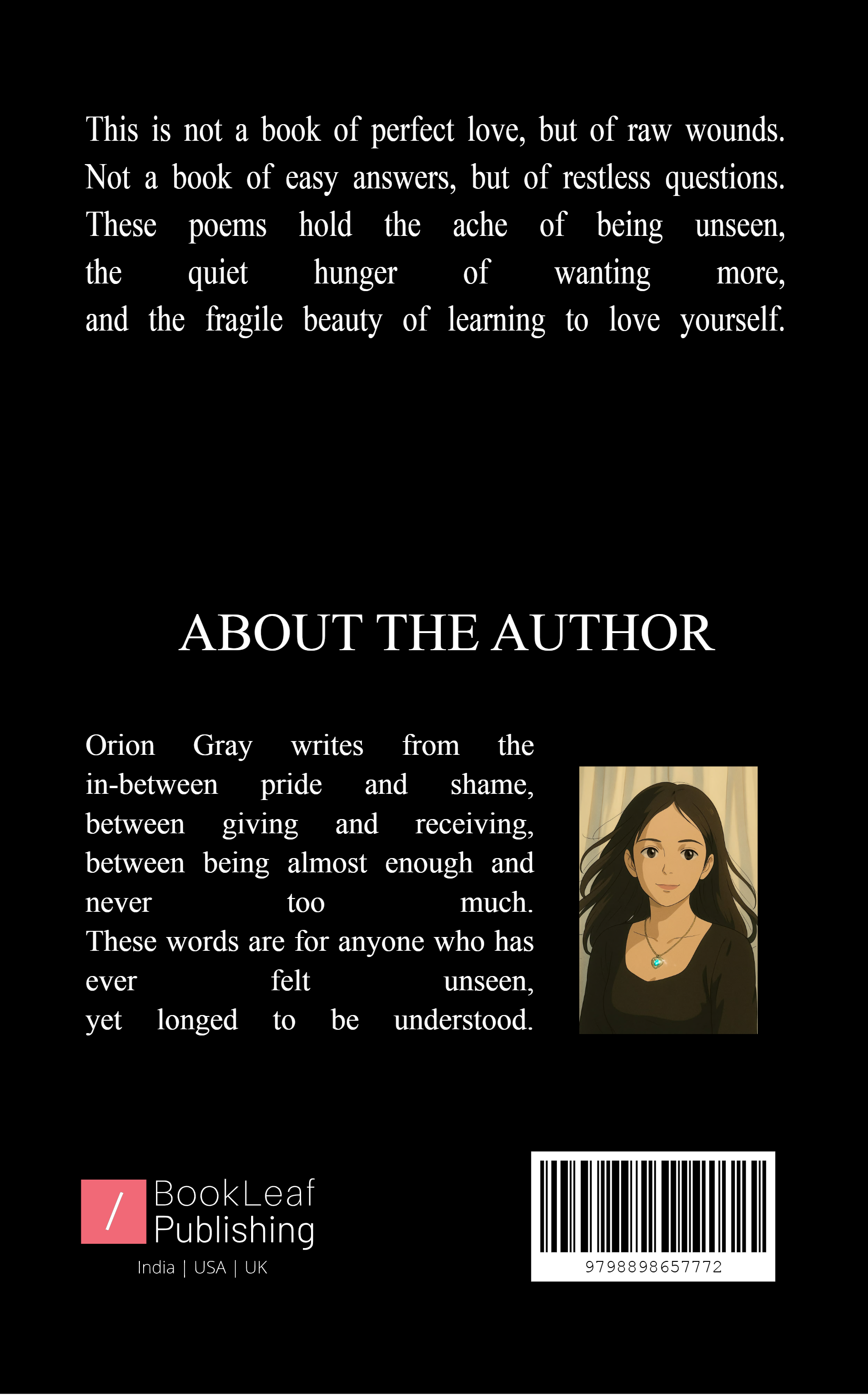 In this collection, you will find poems that speak to the unseen corners of the heart: the quiet ache of wanting to belong, the struggle of self-love amidst unmet expectations, and the fragile beauty of moments where understanding oneself becomes the first step toward freedom.