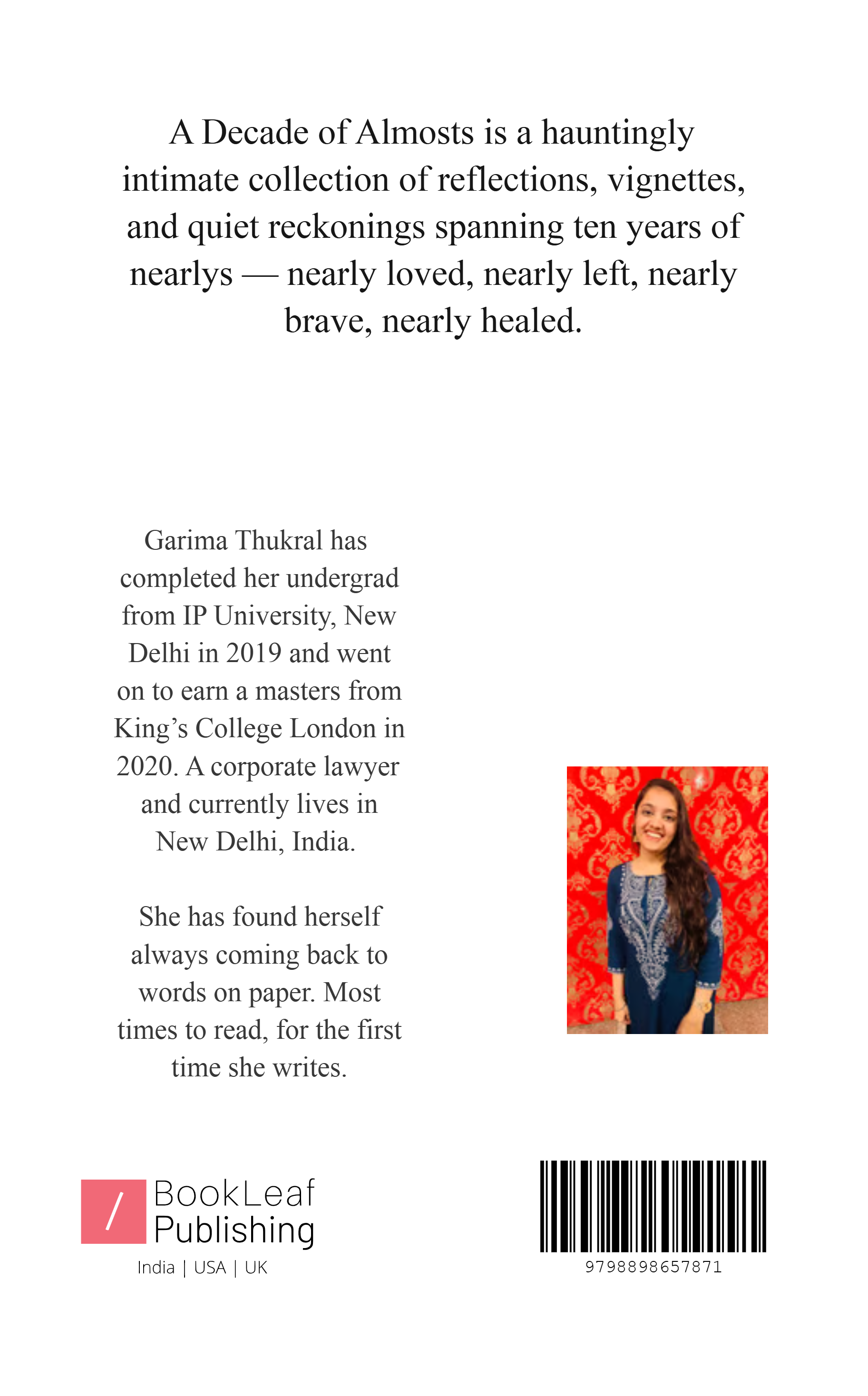 A Decade of Almosts is a hauntingly intimate collection of reflections, vignettes, and quiet reckonings spanning ten years of nearlys — nearly loved, nearly left, nearly brave, nearly healed.