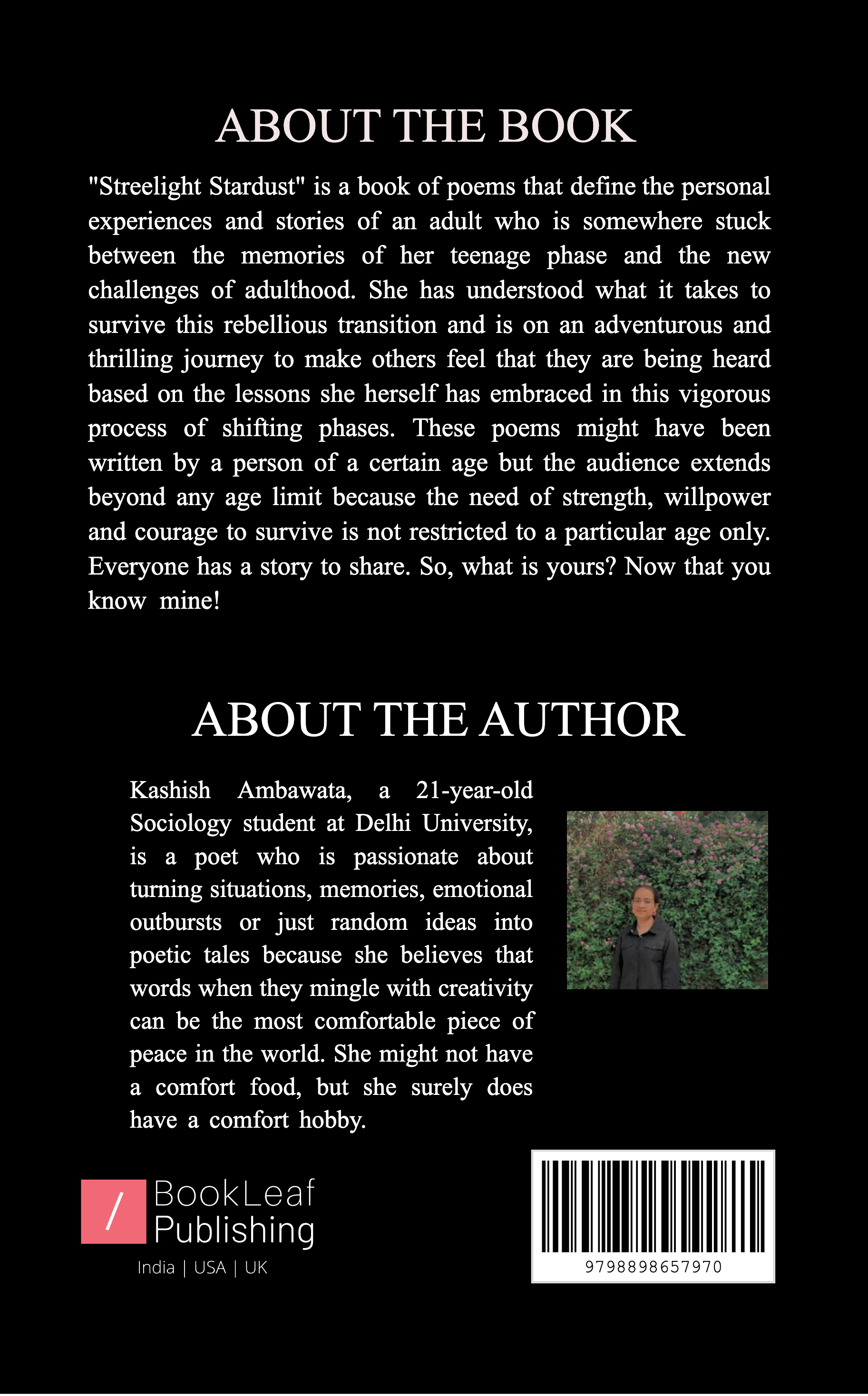 "Streelight Stardust" is a book of poems that define the personal experiences and stories of an adult who is somewhere stuck between the memories of her teenage phase and the new challenges of adulthood. She has understood what it takes to survive this rebellious transition and is on an adventurous and thrilling journey to make others feel that they are being heard based on the lessons she herself has embraced in this vigorous process of shifting phases. These poems might have been written by a person of a certain age but the audience extends beyond any age limit because the need of strength, willpower and courage to survive is not restricted to a particular age only.