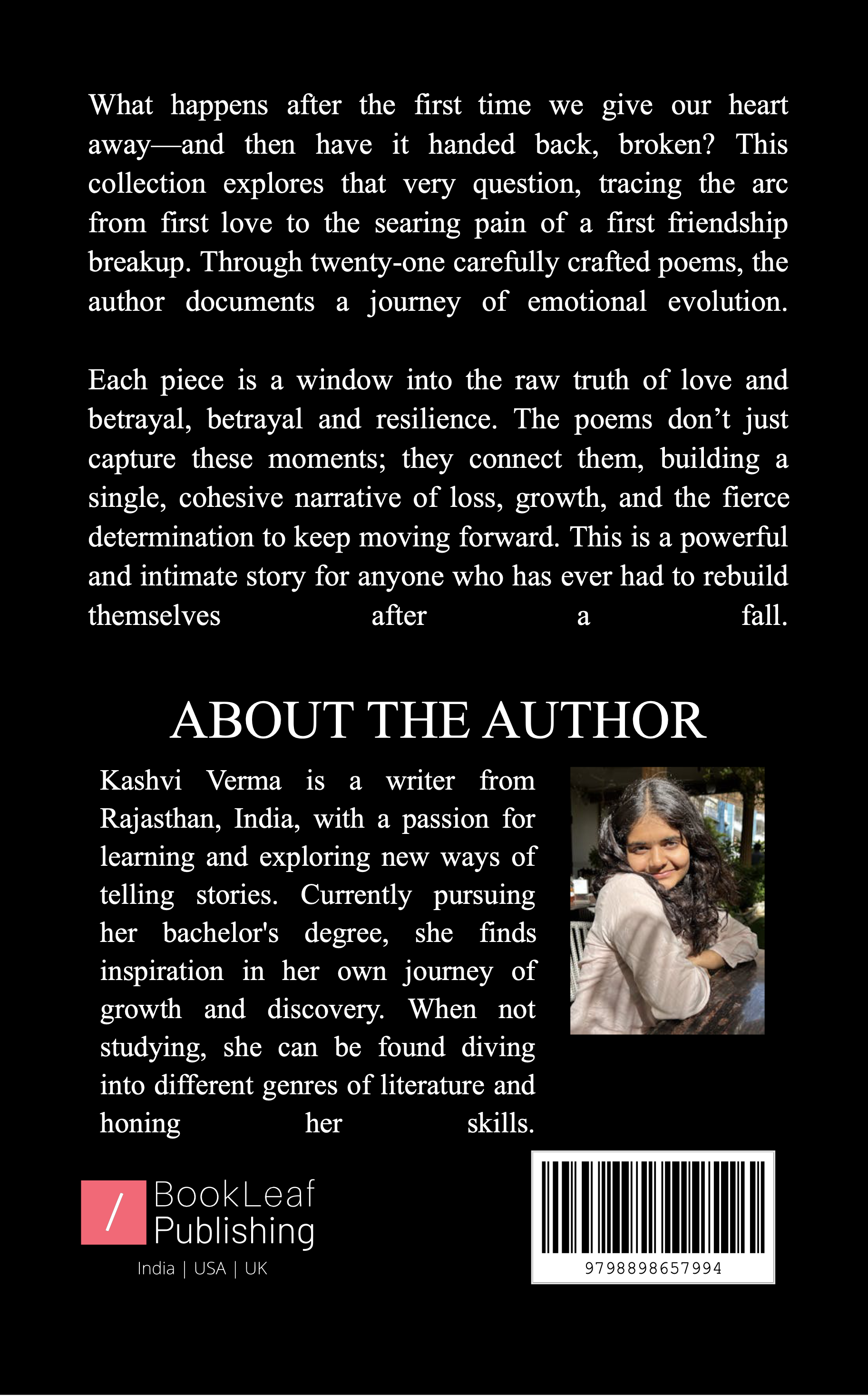 What happens after the first time we give our heart away -and then have it handed back, broken? This collection explores that very question, tracing the arc from first love to the searing pain of a first friendship breakup. Through twenty-one carefully crafted poems, the author documents a journey of emotional evolution. Each piece is a window into the raw truth of love and betrayal, betrayal and resilience. The poems don't just capture these moments; they connect them, building a single, cohesive narrative of loss, growth, and the fierce determination to keep moving forward. This is a powerful and intimate story for anyone who has ever had to rebuild themselves after a fall.