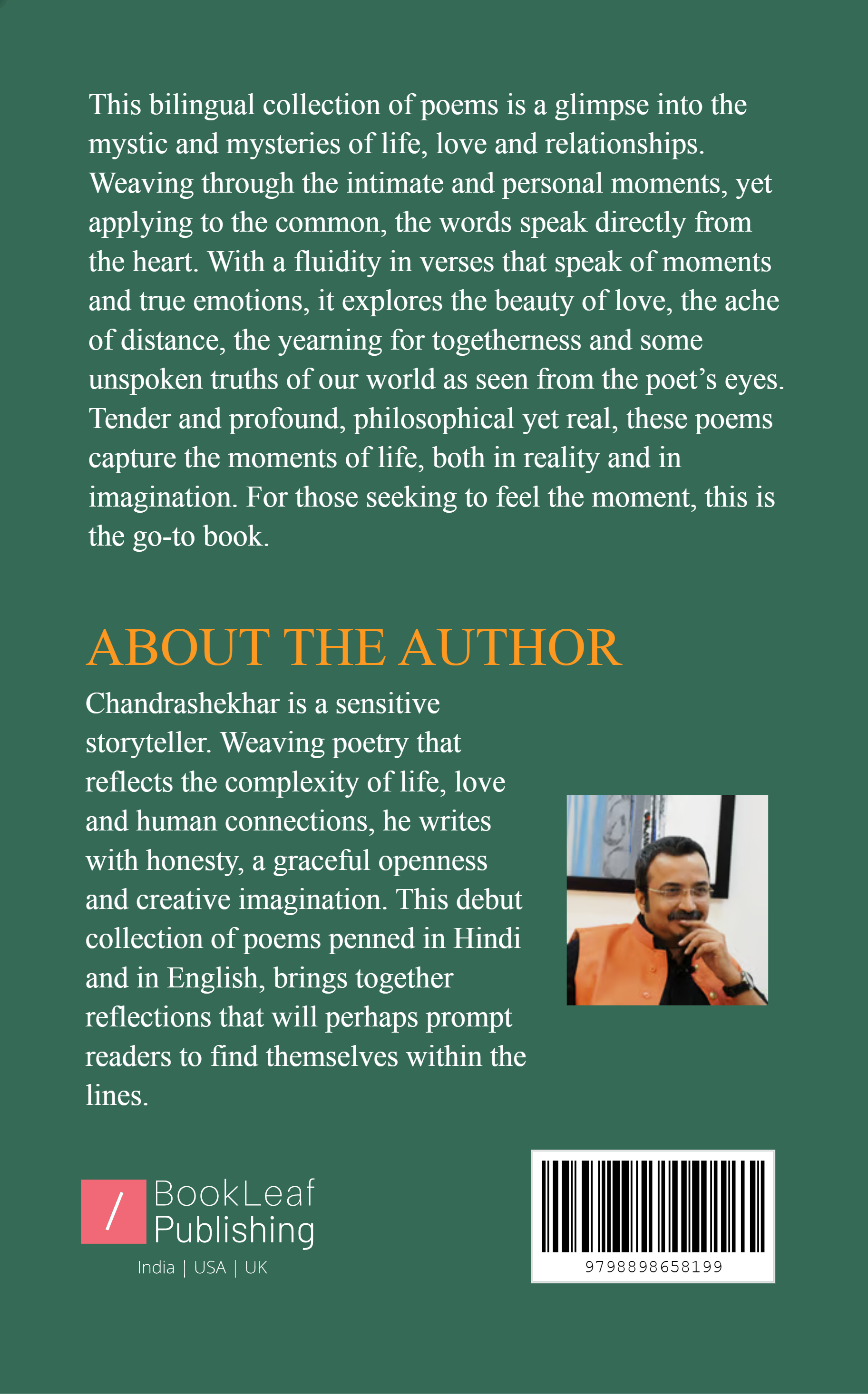 This bilingual collection of poems is a glimpse into the mystic and mysteries of life, love and relationships. Weaving through the intimate and personal moments, yet applying to the common, the words speak directly from the heart. With a fluidity in verses that speak of moments and true emotions, it explores the beauty of love, the ache of distance, the yearning for togetherness and some unspoken truths of our world as seen from the poet’s eyes. Tender and profound, philosophical yet real, these poems capture the moments of life, both in reality and in imagination. For those seeking to feel the moment, this is the go-to book.