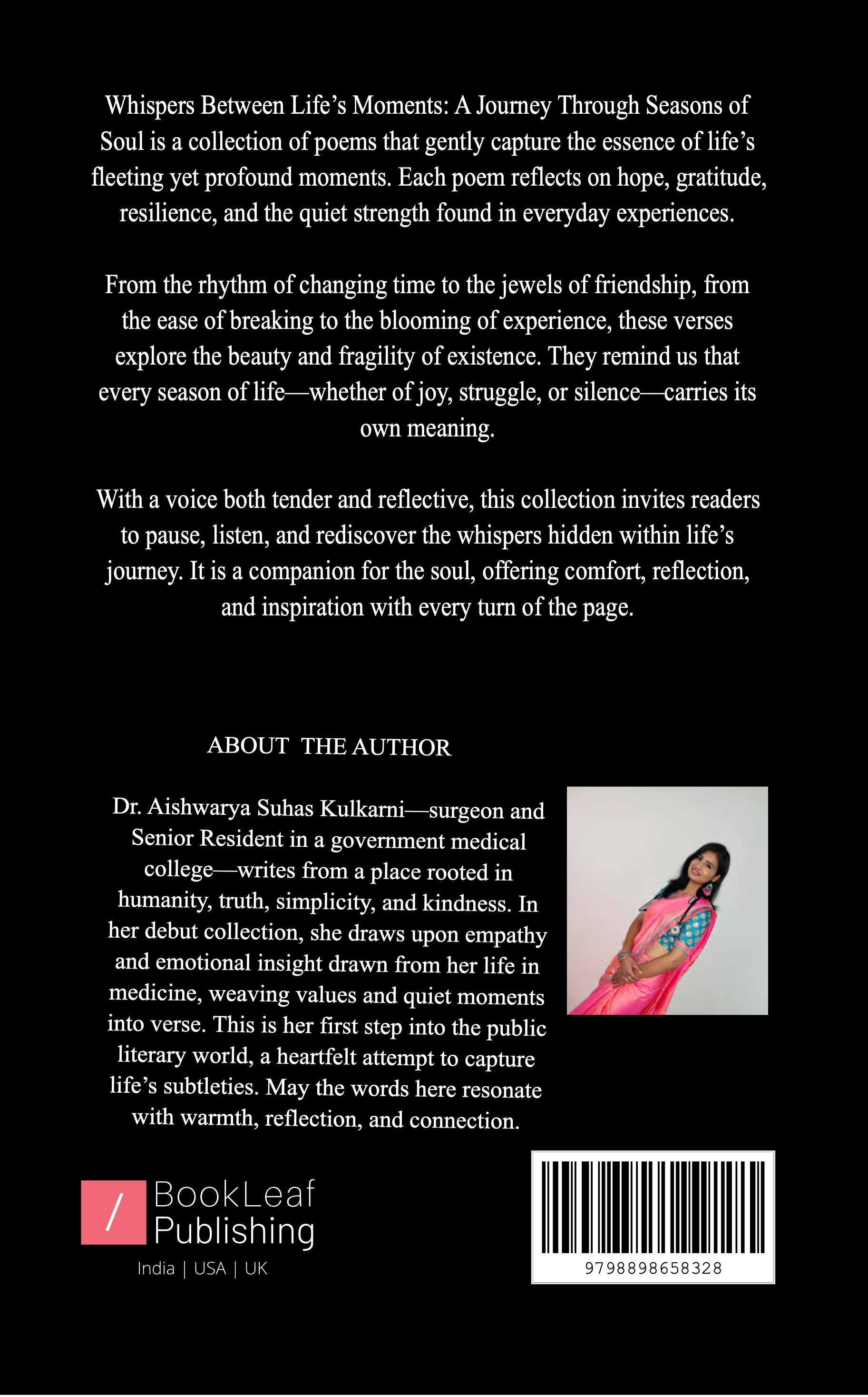 Whispers Between Life’s Moments: A Journey Through Seasons of Soul is a collection of poems that gently capture the essence of life’s fleeting yet profound moments. Each poem reflects on hope, gratitude, resilience, and the quiet strength found in everyday experiences.