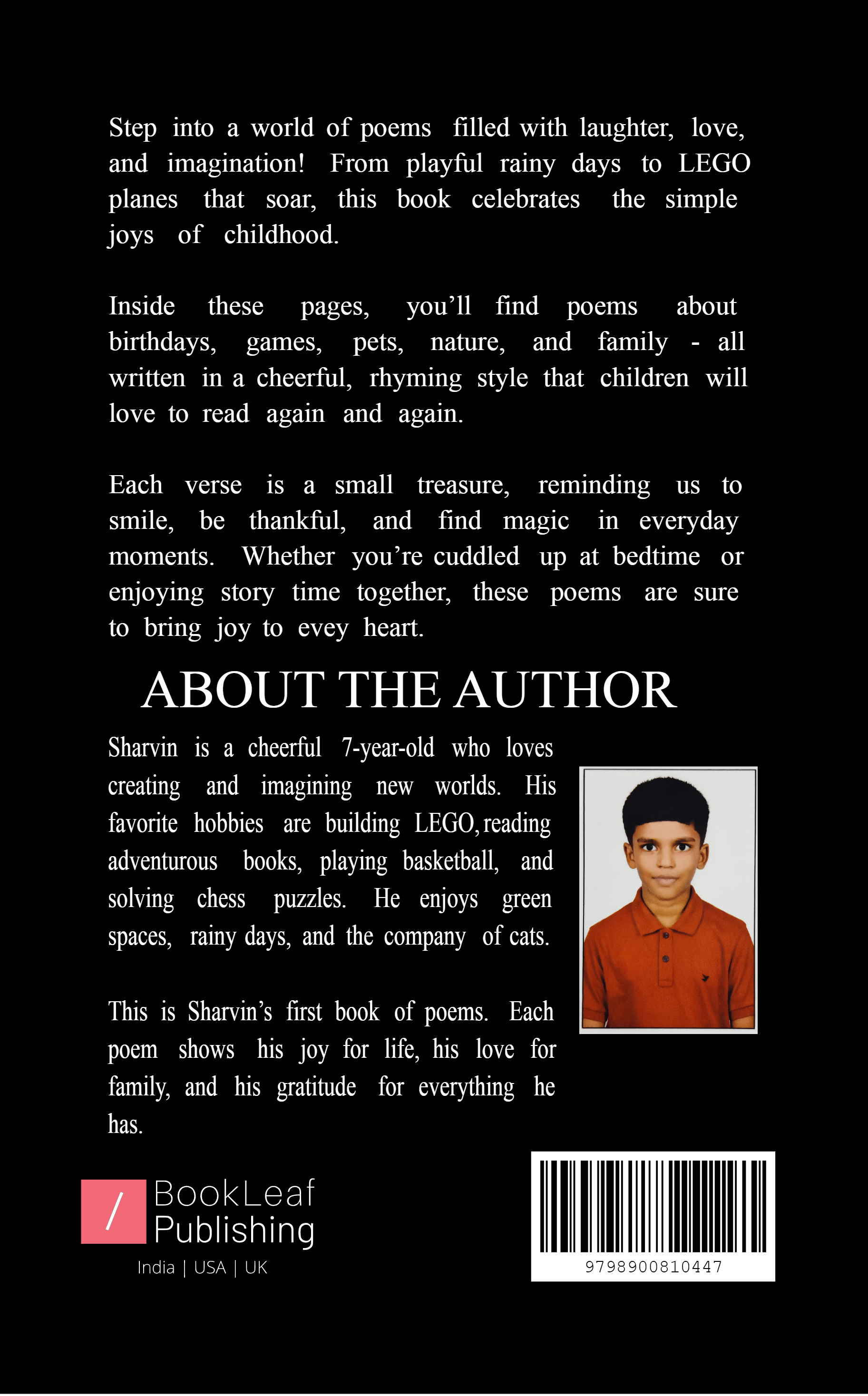 This book is a treasure chest of poems written with fun, imagination, and love. From celebrating birthdays to building Lego planes, playing in the rain, enjoying pets, and finding happiness in family and nature, these poems capture the magic of being a child. Every page is filled with rhymes that are easy to read and delightful to share aloud. Sharvin’s words remind us to be grateful, stay playful, and enjoy life’s little joys. Perfect for children and families, this collection makes reading a heartwarming adventure.