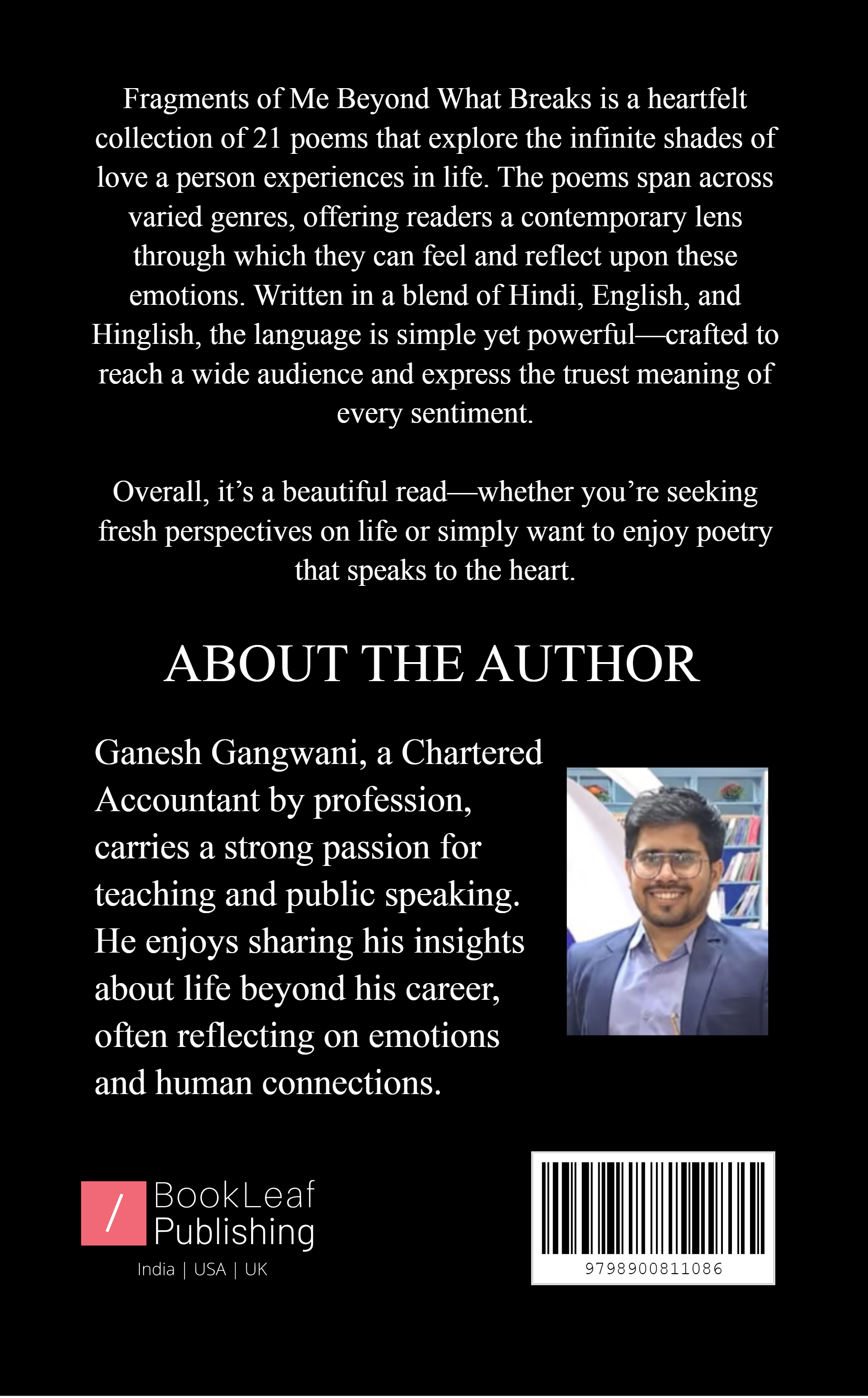 Ganesh Gangwani, a Chartered Accountant by profession, carries a strong passion for teaching and public speaking. He enjoys sharing his insights about life beyond his career, often reflecting on emotions and human connections.