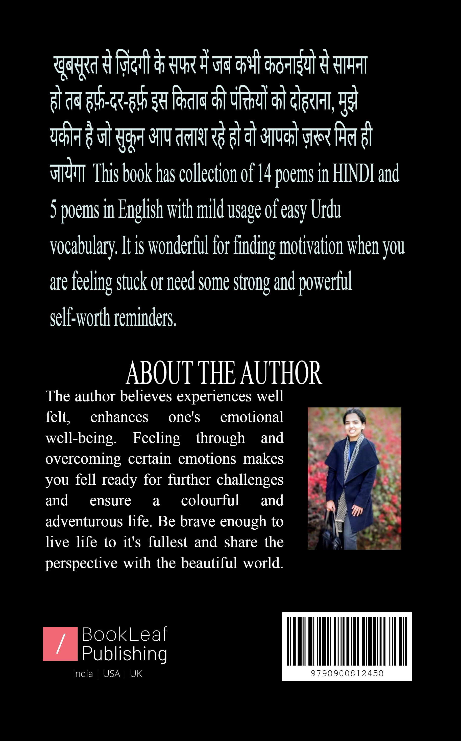 This book has collection of author's poem from her late childhood to adulthood, with articulated use of language. It is helpful for students and enjoyable for adults having powerful motivating poems both in English and Hindi. It covers topics from memories to moments, love for mother to motherland, from seasons to moon, from anger to calmness where readers feel connected in oneness of universe.