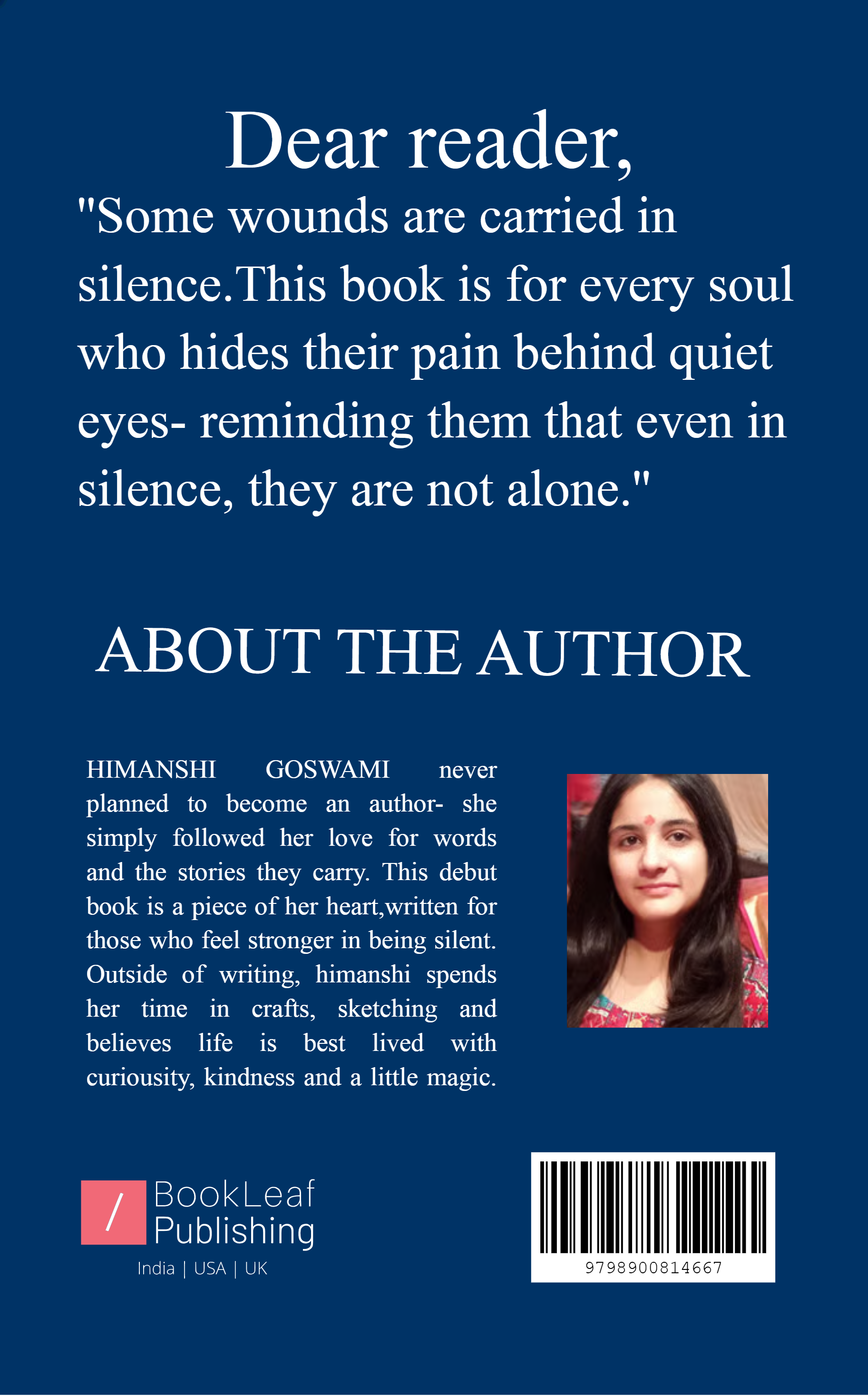 This book is a journey into the hearts of those who suffer in silence. It speaks for the unspoken, for the people who carry pain quietly, never asking for help but longing to be understood. It explores the weight of hidden struggles, the beauty of vulnerability, and the hope that healing is possible. More than just pages, it is a companion for anyone who has ever felt unheard- a reminder that even in silence, you are not alone.