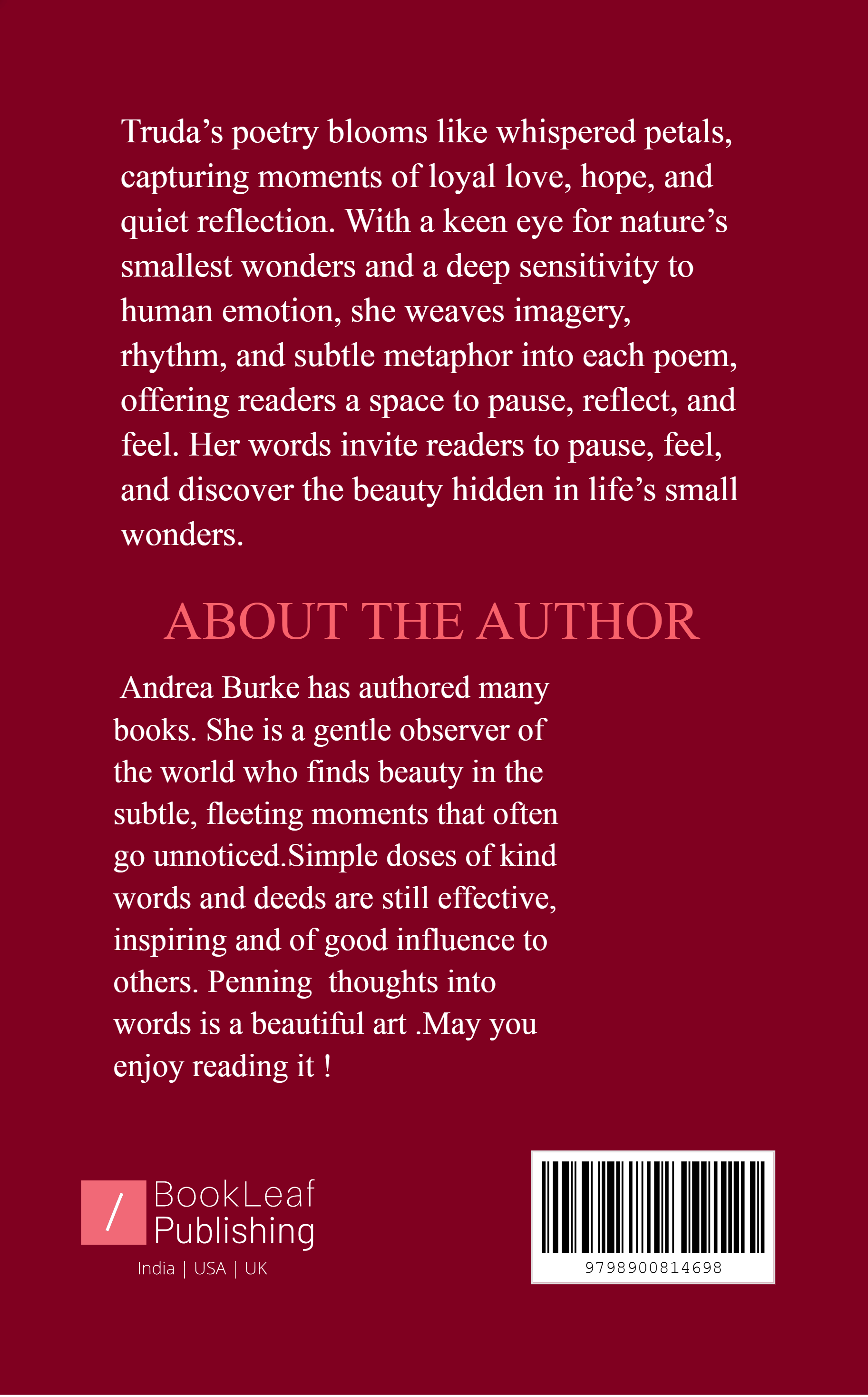 “Truda’s Whispering Petal Doses” is a tender collection of poems that captures life’s fragile beauty through the soft voice of petals. Within these pages, love blooms in its purest forms — loyal and enduring. Each poem serves as a gentle dose of reflection, offering resilience in the face of struggles, hope in moments of silence, and an intimate call to pause amidst the rush of daily life. It is more evocative and literary by weaving in devices like alliteration, metaphor, imagery, personification, and rhythm. Blending themes of nature, relationships, and inner strength, this book invites readers into a garden of emotions where whispers become lessons.