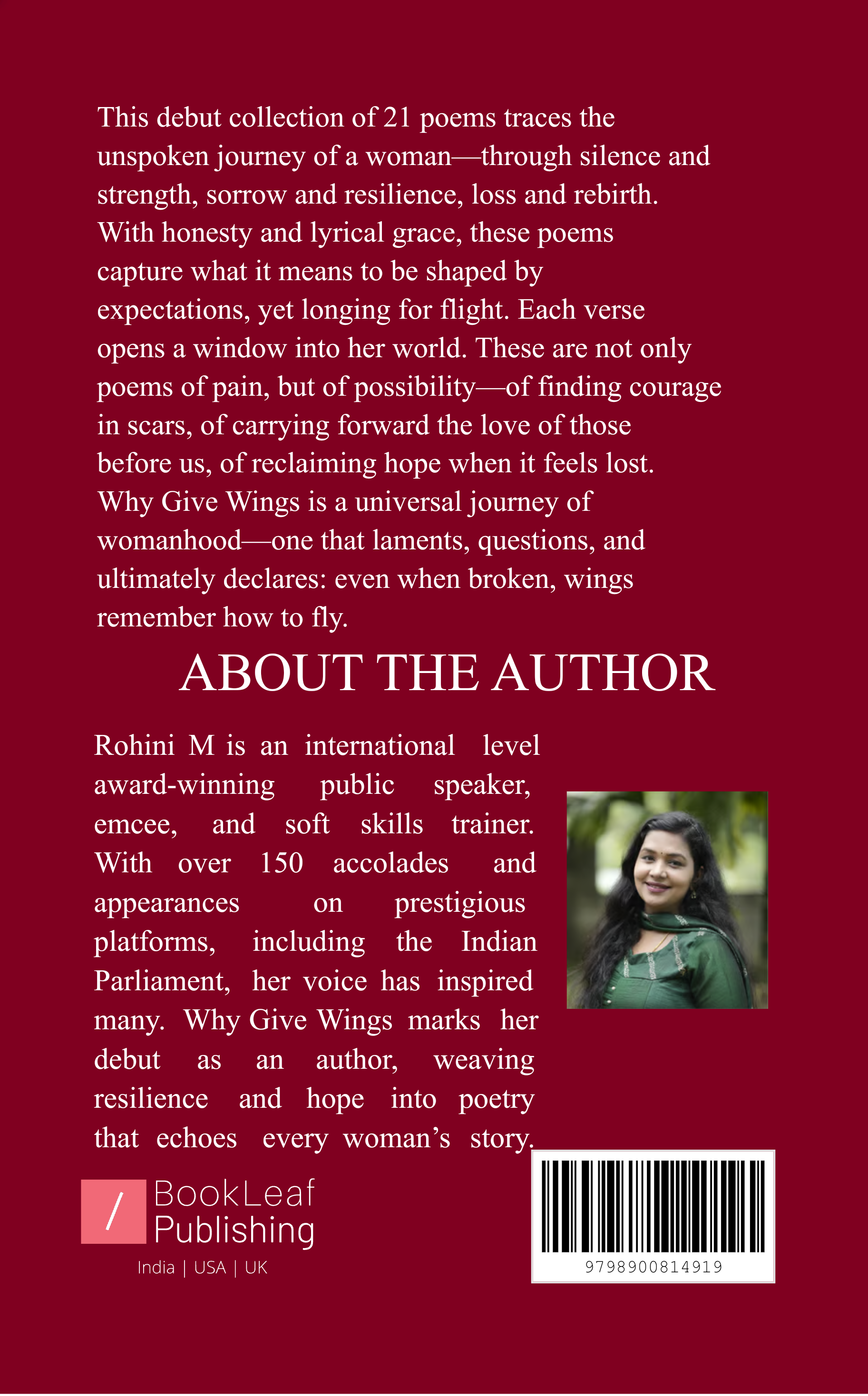 Why Give Wings is a powerful collection of 21 poems that capture the unspoken journey of womanhood through silence and strength, sorrow and resilience, loss and renewal. With raw honesty and lyrical grace, Rohini M reflects on identity, expectations, sacrifice, and hope. These poems speak not only of pain, but of possibility, of clipped wings that still remember how to fly. Universal and deeply personal, this debut collection is both a lament and a declaration, offering every woman a voice, and every reader a reminder of the courage carried within.