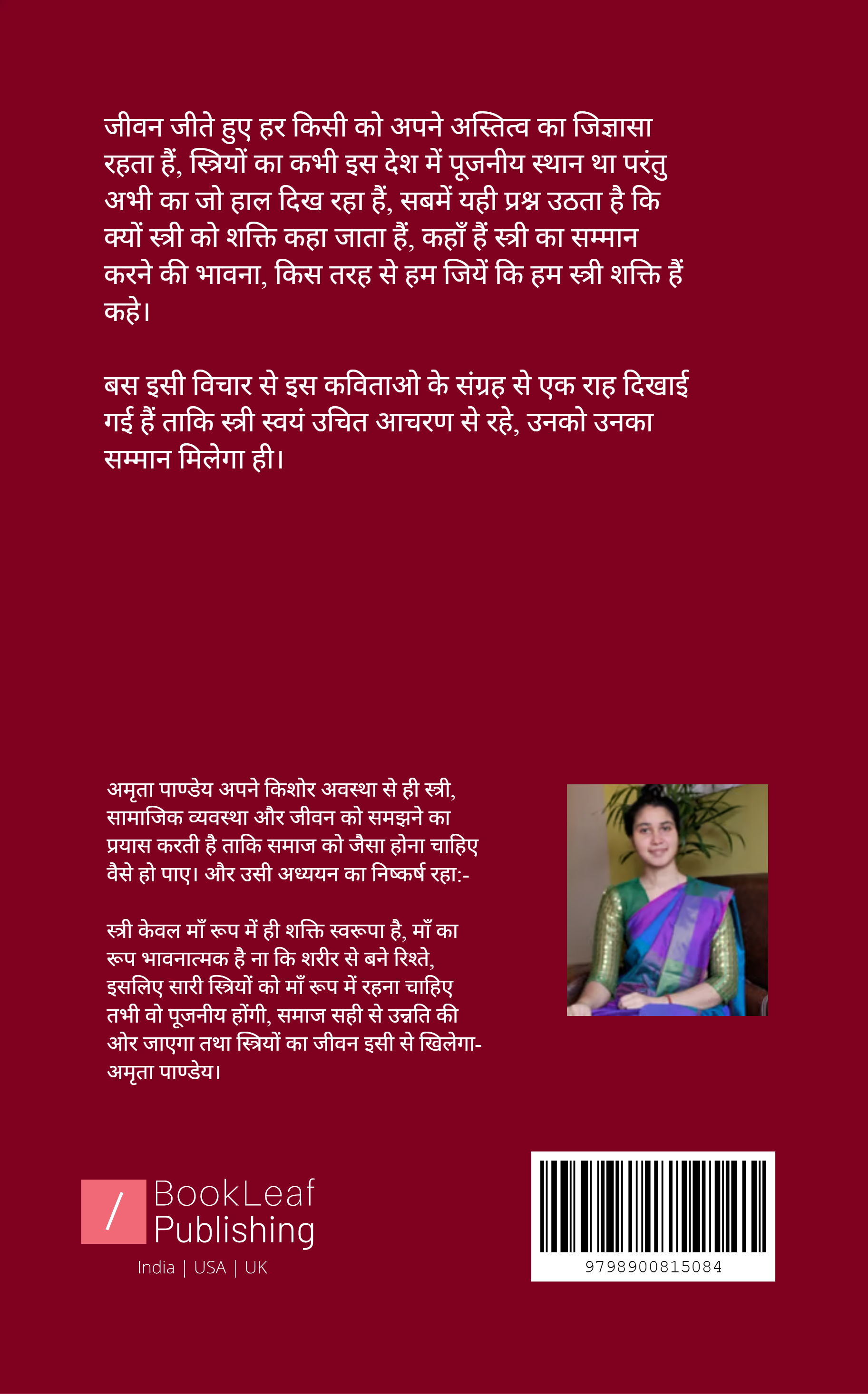 इस छोटे से कविताओ के संग्रह से एक राह दिखाने का प्रयास किया गया हैं ताकि स्त्री स्वयं उचित आचरण से रहे। स्त्री स्वरूप ही ये पूरी सृष्टि हैं और अब ऐसा हाल हैं कि खुद समाज में सुरक्षित नहीं, सम्मनित नहीं हैं। स्त्री ही तो समाज का निर्माण करती हैं, तो सबसे पहले जरूरी हैं की स्त्री स्वयं उचित आचरण को जाने और चले, फिर समाज अपने आप सही हो जाएगा। जहाँ भी देखा जाता है पुरुषो की तरह जिने में होड़ लगी हैं, परंतु स्त्रियों का अपना गुण और जीने का तारिका या भावना होता है, यहीं तो करण हैं की स्त्रियों को पूजा जाता था वो हमेशा ही पूजनीय हैं, स्त्री को स्त्री के रूप में रहना चाहिए तभी समाज आगे बढ़ेगा, ये केवल स्त्री शरीर से होने से नहीं होगा, आप पूर्ण स्त्री होंगी, तब आप शक्ति होंगी, यही बताया गया है इसमे।