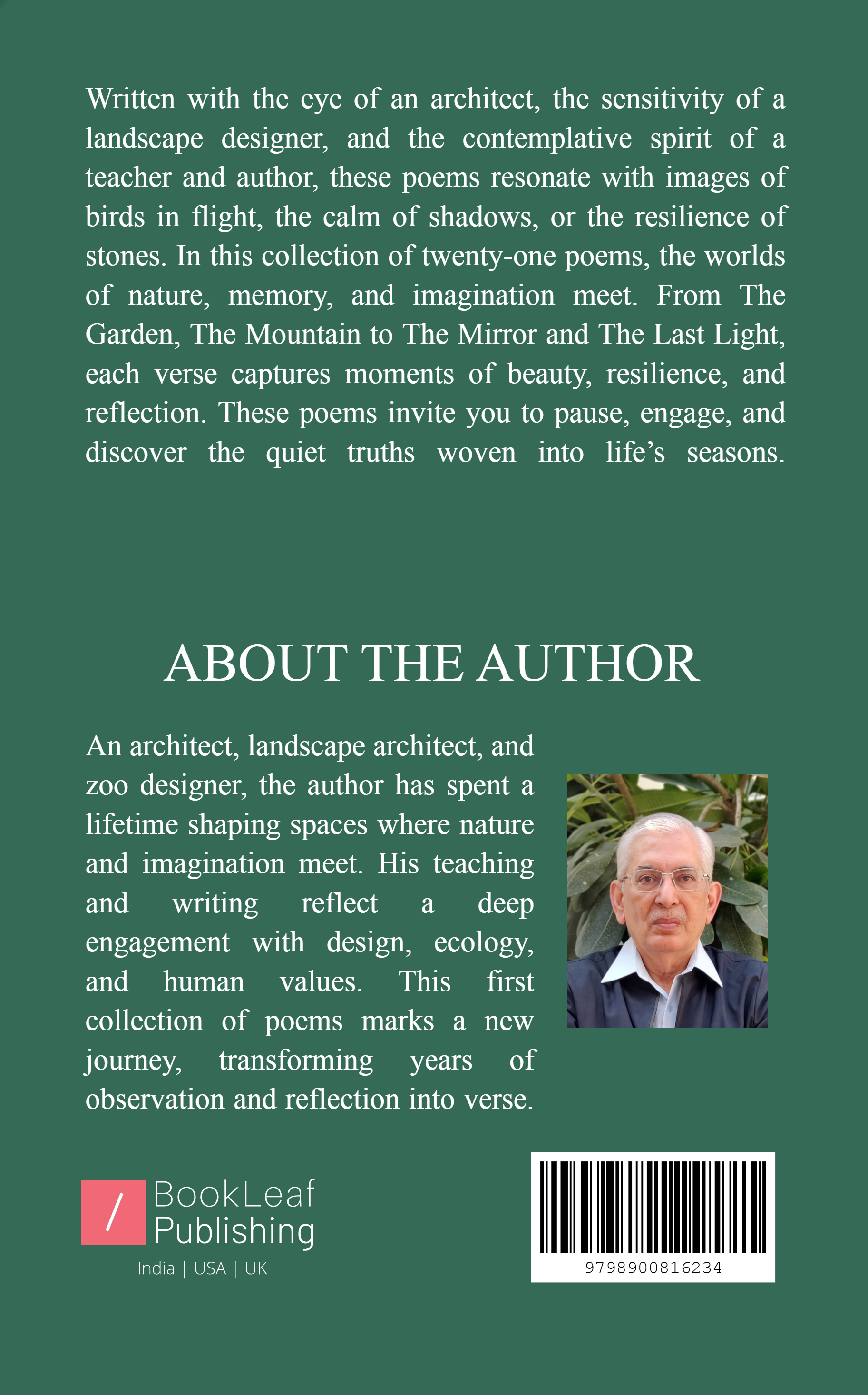 Written with the eye of an architect, the sensitivity of a landscape designer, and the contemplative spirit of a teacher and author, these poems resonate with images of birds in flight, the calm of shadows, or the resilience of stones. In this collection of twenty-one poems, the worlds of nature, memory, and imagination meet. From The Garden, The Mountain to The Mirror and The Last Light, each verse captures moments of beauty, resilience, and reflection. These poems invite you to pause, engage, and discover the quiet truths woven into life’s seasons.