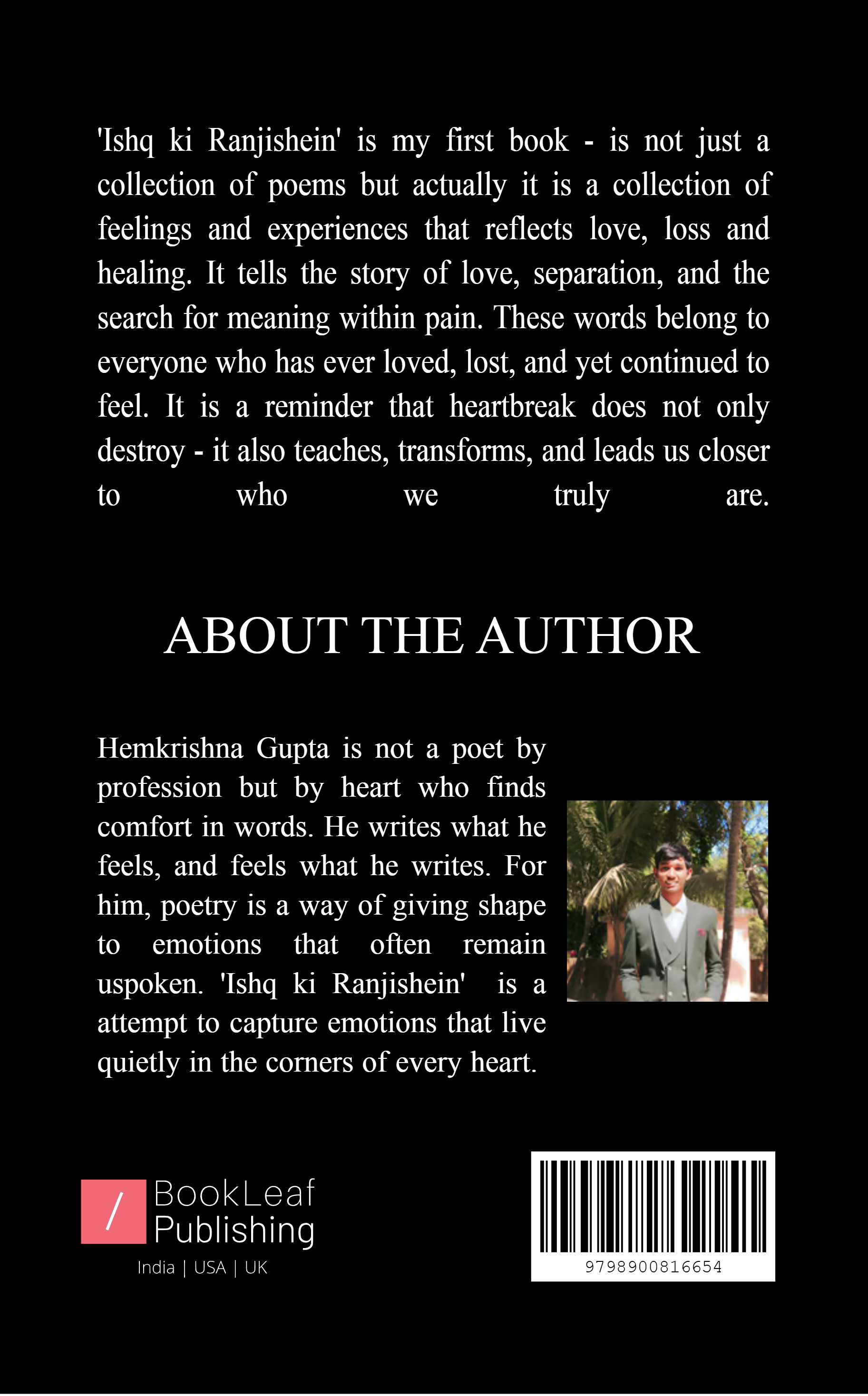 'Ishq Ki Ranjishein' is a journey of love that never found its end, of emotions that were felt deeply but remained unspken. It is a collection of feelings, emotions and experiences that reflects, love, loss and healing. This book is not only about love lost, but also about finding oveself through the silence it leaves behind. These words belong to everyone who has ever loved, lost, and yet continued to feel...