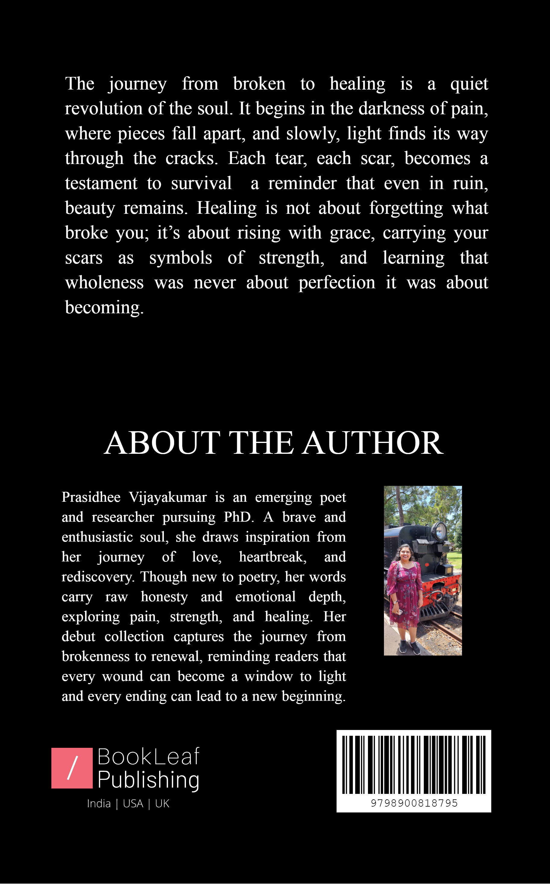 “Echoes Of A Lost Soul” is a heartfelt collection of poems tracing the journey from pain to self-discovery, from heartbreak to hope. Each verse captures the rawness of being broken, the quiet moments of reflection, and the courage it takes to rise again. Through vulnerability and resilience, these poems explore grief, loss, healing, and transformation, offering both solace and inspiration. Readers will find themselves walking through shadows and into light, recognizing their own struggles mirrored in these pages. This is a tender, uplifting tribute to the power of healing and the beauty that can grow from brokenness.