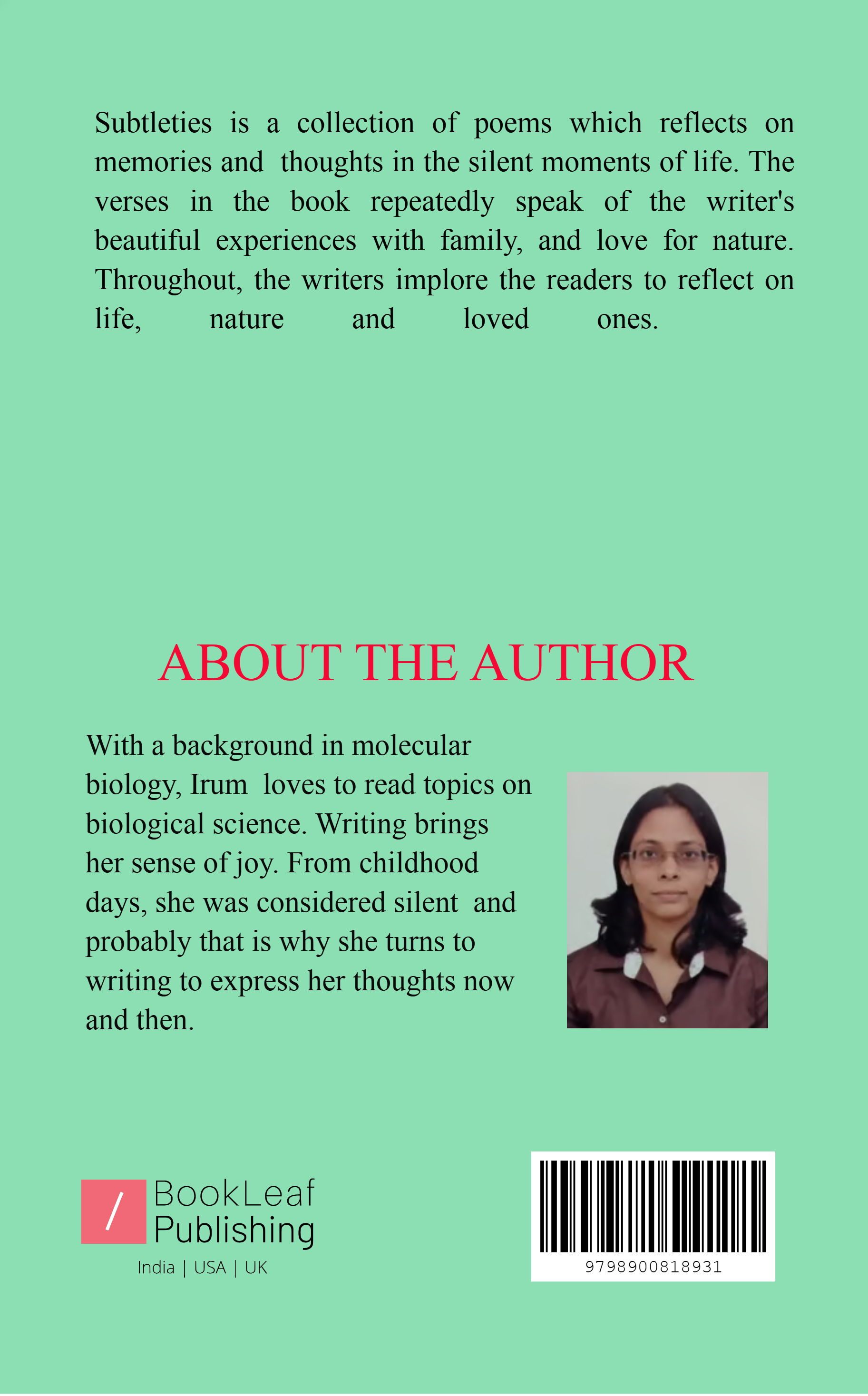 Subtleties is short poetry book. It reflects on memories and contemplates on life moments.