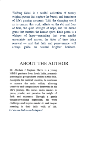 'Shifting Skies' is a soulful collection of twenty original poems that capture the beauty and transience of life’s passing moments. With the changing world as its canvas, this work reflects on the ebb and flow of time, the quiet strength of hope, and the divine grace that sustains the human spirit. Each poem is a whisper of hope—reminding that even amidst uncertainty and sorrow, the tides of time bring renewal—and that faith and perseverance will always guide us toward brighter horizons. This book marks his first original work of poetry—a reflection of his contemplations on divinity, humanity, and the profound connection between the two.