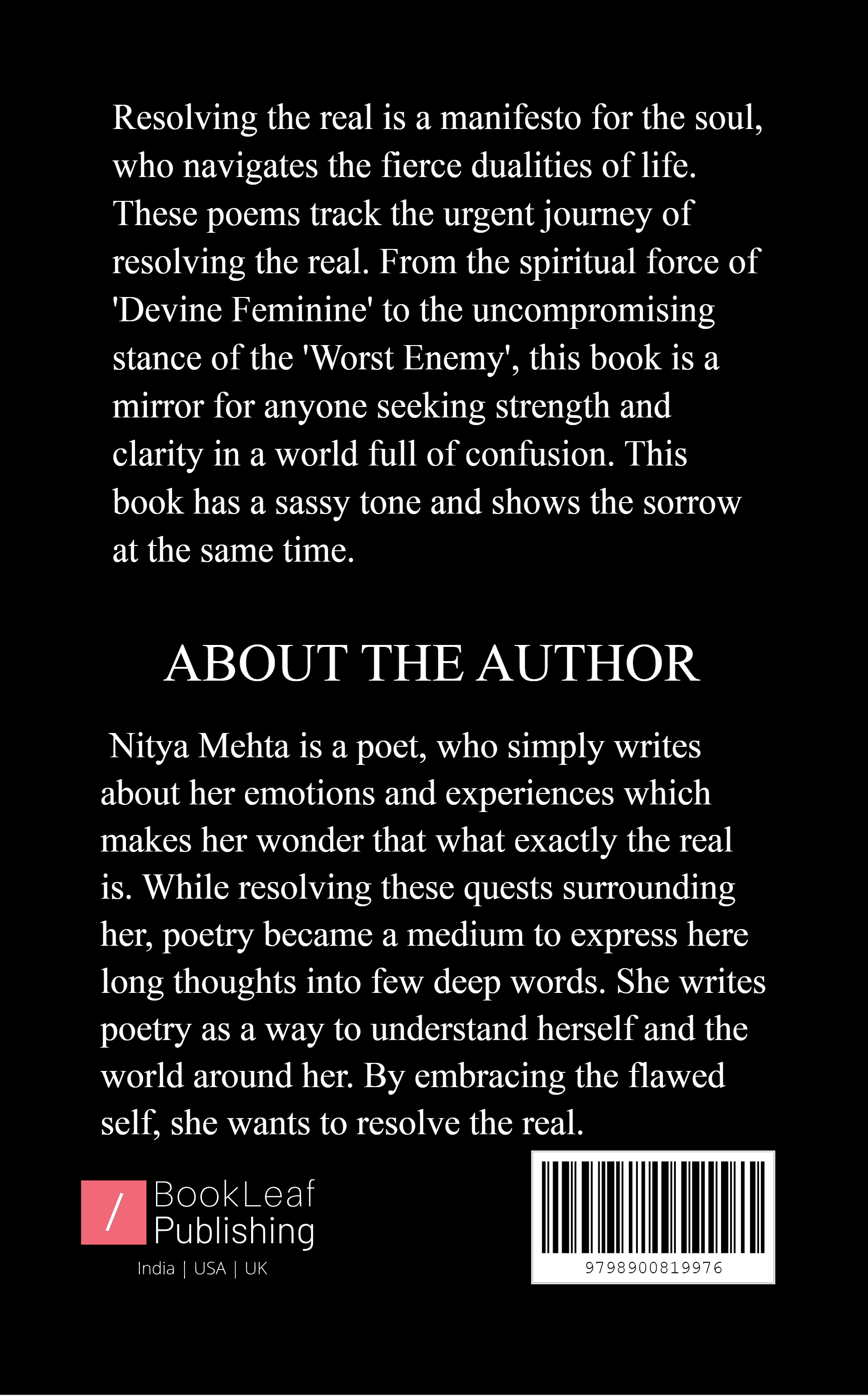 Resolving the real is a manifesto for the soul, who navigates the fierce dualities of life. These poems track the urgent journey of resolving the real. From the spiritual force of 'Devine Feminine' to the uncompromising stance of the 'Worse Enemy', this book is a mirror for anyone seeking strength and clarity in a confusing world. This book has the sassy tone and shows the sorrow at the same time.